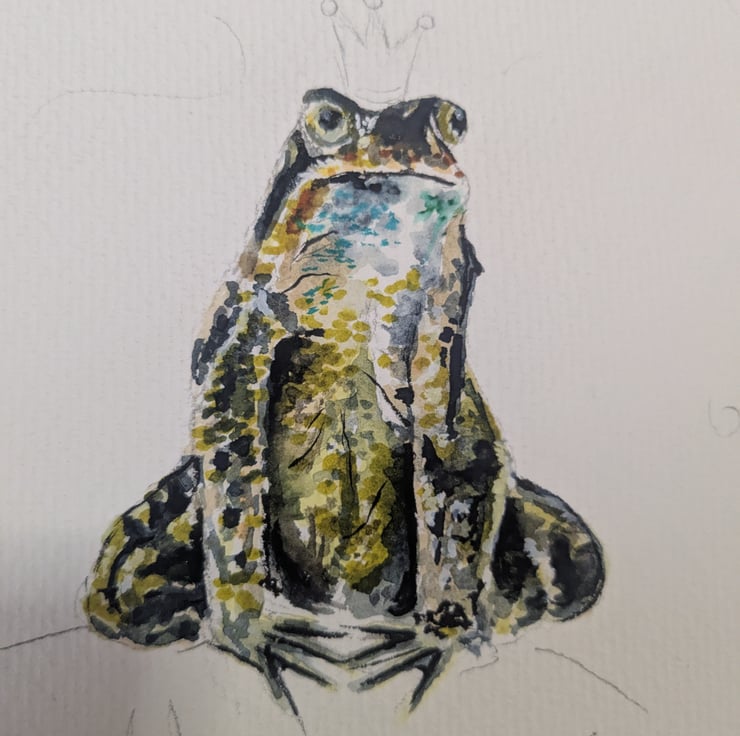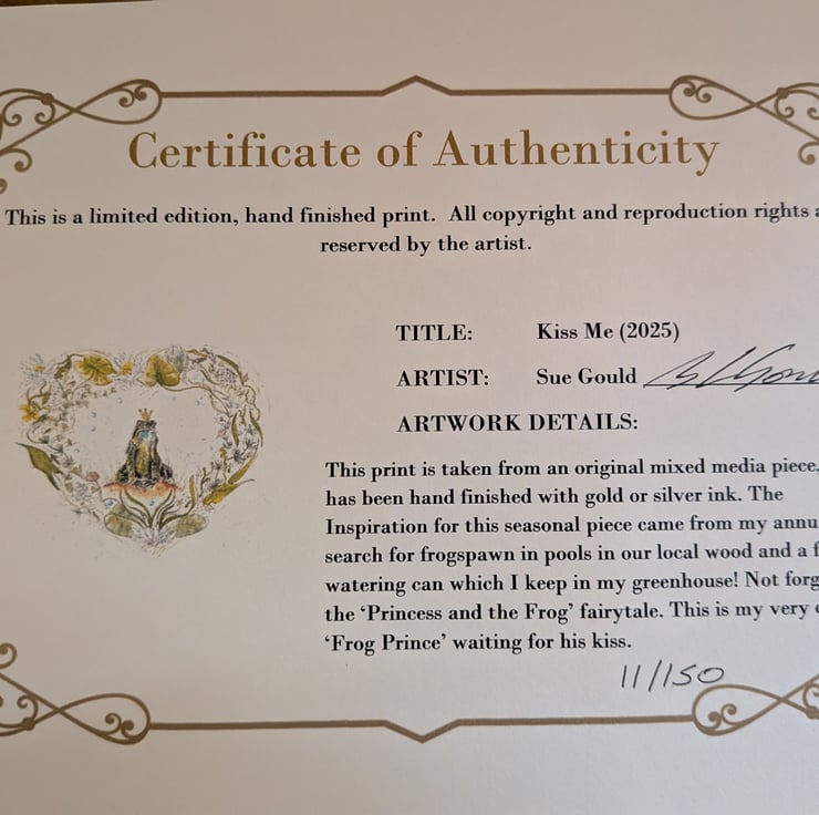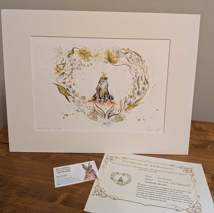 A limited edition, hand finished, signed high quality print of an original mixed media painting of a frog prince. The original was painted with watercolour. I then used polychromos artists colouring pencil with drawing inks and finished with some ink and paint splashes. Every print is hand finished with gold ink, making no two the same. Each print is professionally mounted and cellophane wrapped.
