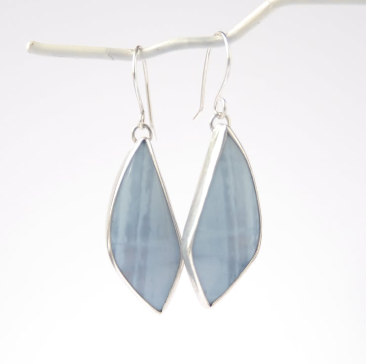 These unusual earrings feature free form drops of blue opal which has been bezel set in sterling silver and finished off with simple sterling silver hooks. The blue opal has subtle stripes in baby blue and washed denim (they are a grey blue rather than a vibrant blue), they have a glossy shine to them but don't exhibit any fire. The earrings measure 51mm (top to bottom inc hook) by and about1 5mm across and come in a gift box (the prefect present for someone with a birthday in October as Opal is their birthstone).
