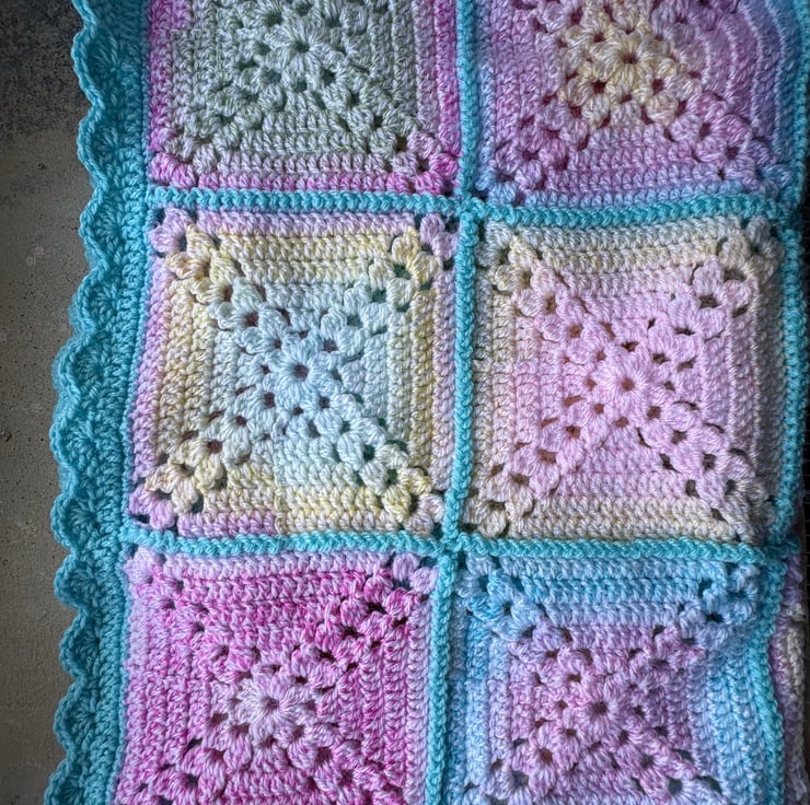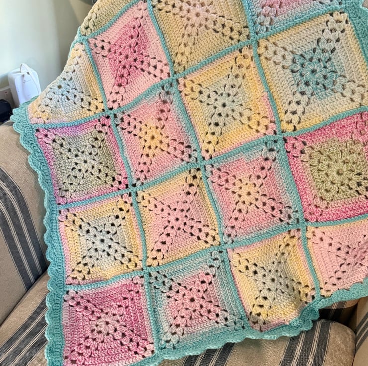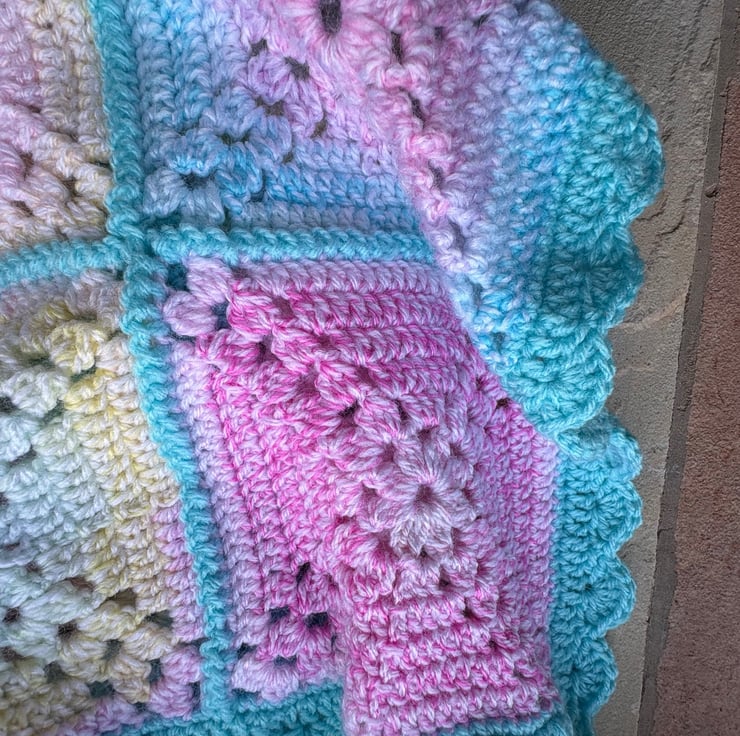 Bright and colourful cot blanket; a beautiful gift that will last well beyond the baby years. This lightweight and cosy blanket is handmade using variegated soft acrylic yarn in shades of pink, blue, green and yellow. The 20 patterned 'granny squares' are joined using a flat braid joining technique in aqua blue coloured yarn. The blanket measures 80 x 65 cm and is finished off perfectly with a gentle scalloped edging in aqua blue. The blanket can be washed at 40oC and reshaped whilst damp. Tumble dry is not recommended. The blanket will be shipped using a tracked delivery service.