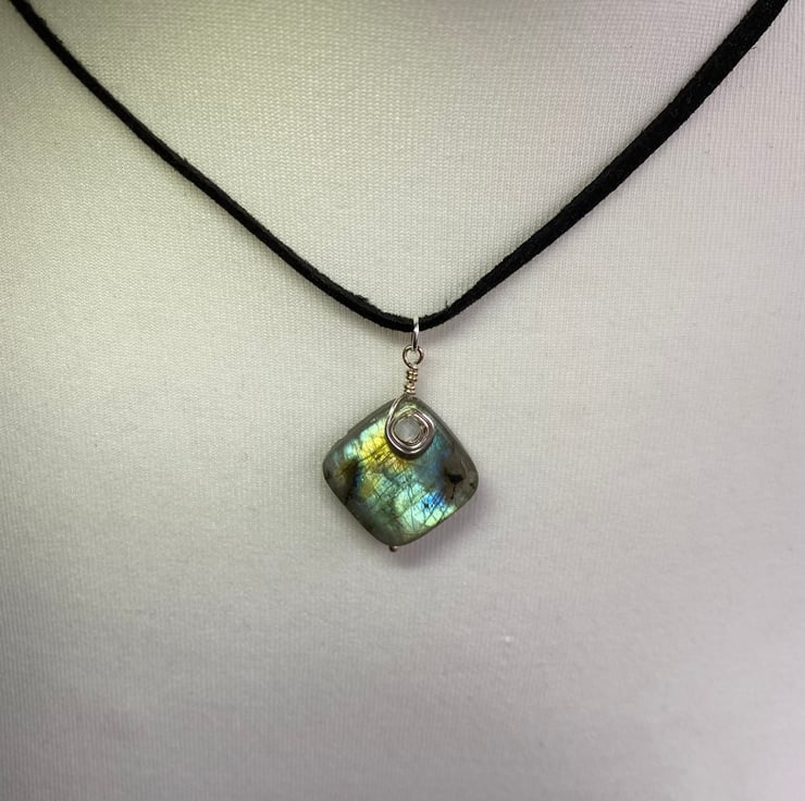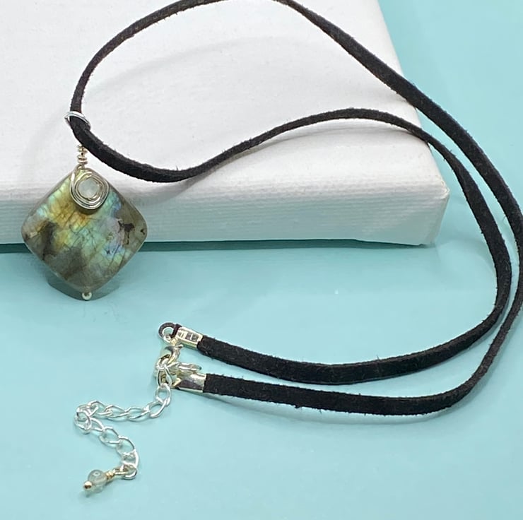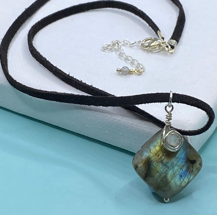 The pendant's strung on black faux suede cord and has a silver plated lobster clasp and 2 inch extender chain, finished with a tiny sparkling labradorite stone.