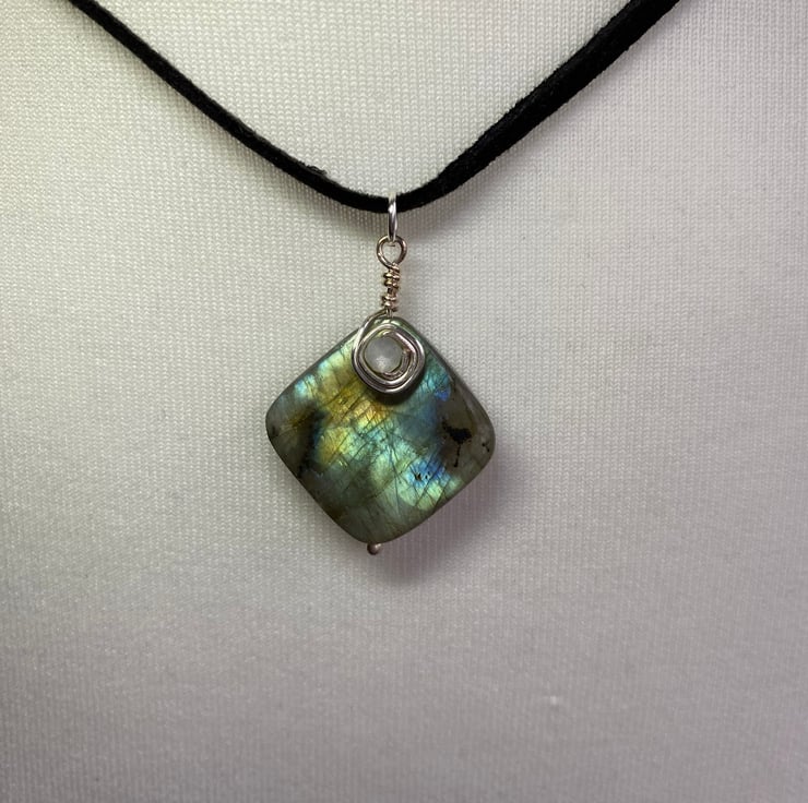 This pendant features a stunning square shaped piece of labradorite, topped with a silver plated wirework spiral with a tiny rainbow moonstone at its centre.