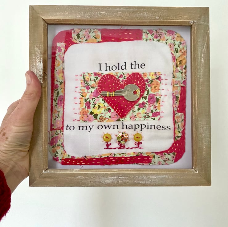 The wording has been printed onto fabric then embellished with stitching.