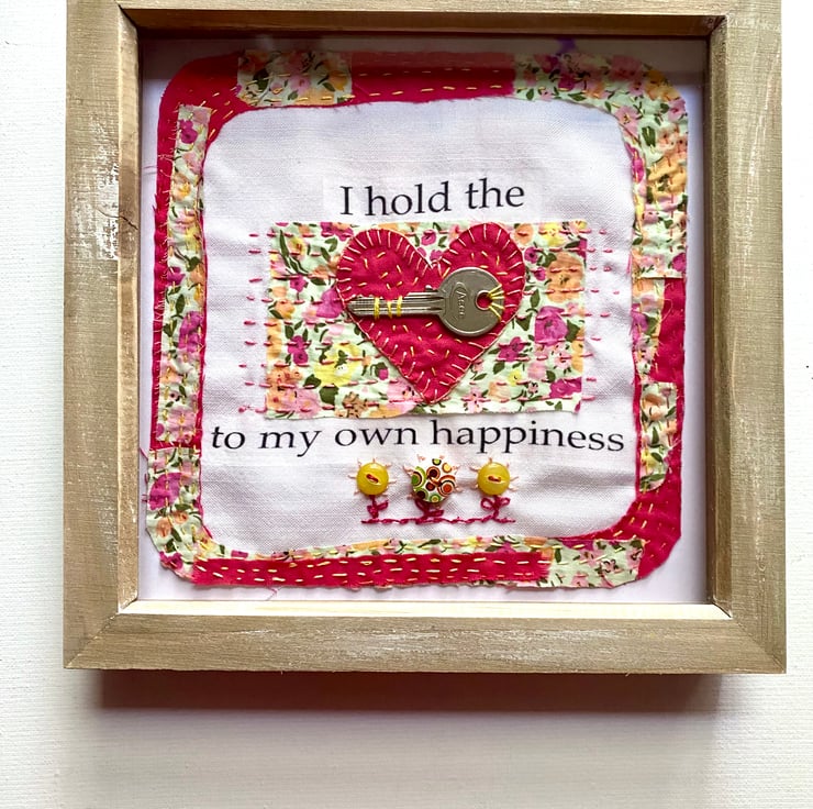 The recycled gold coloured metal key is hand stitched into place on top of a pretty pink heart.