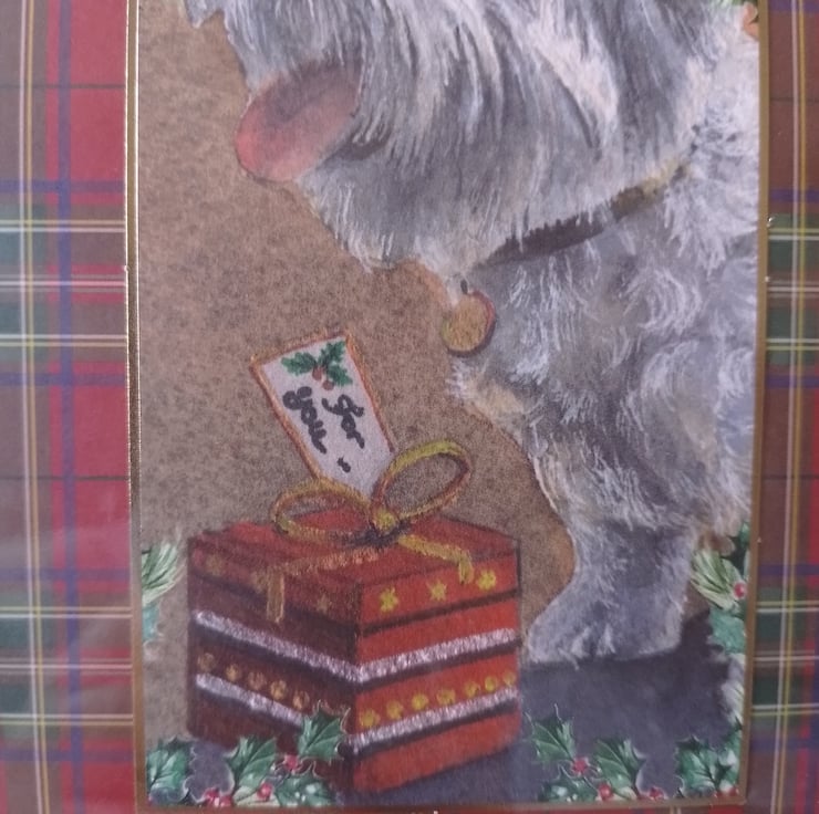 An 8" x 8" square Christmas card showing a lovely dog on a tartan background. All cards come with matching envelopes and are cellophane-wrapped to keep them clean. this lovely dog on a tartan card is ready for the festive season with his gift!