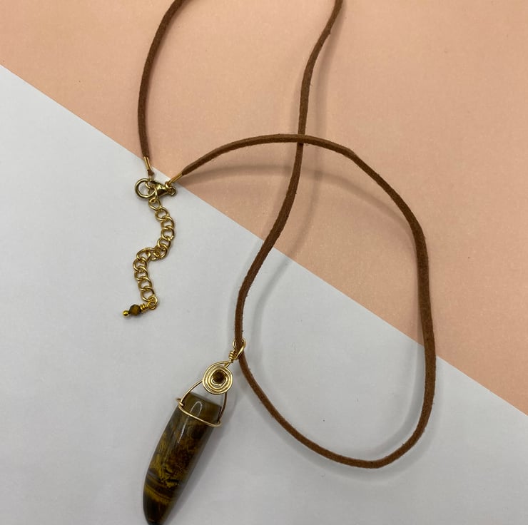The pendant's on faux suede cord to match the colour of the stone and features a gold tone lobster clasp and 2 inch extender chain, finished with a further tiny tiger's eye at its end.