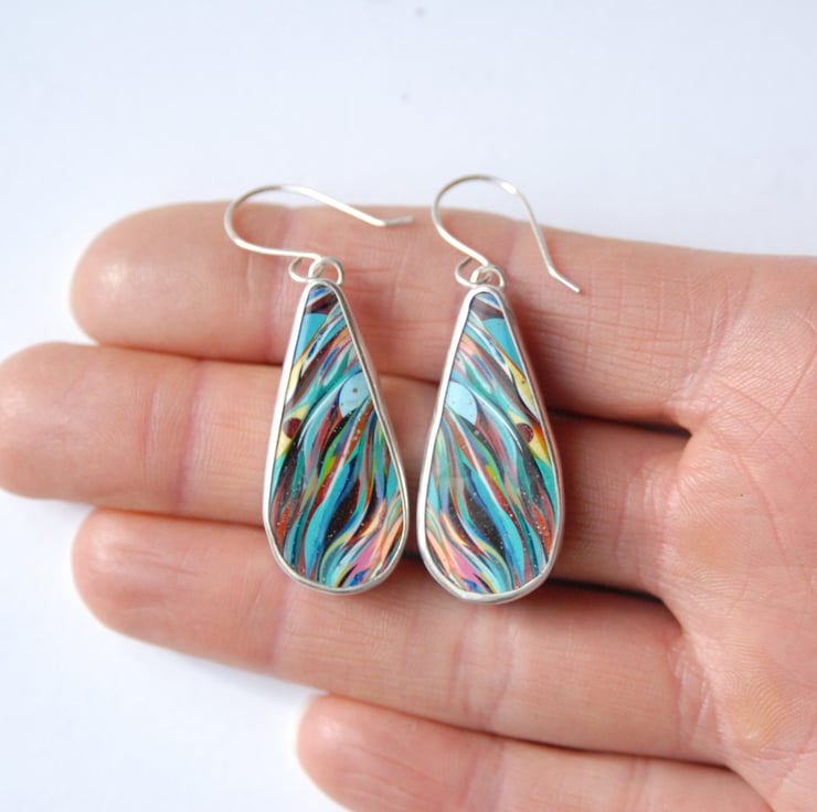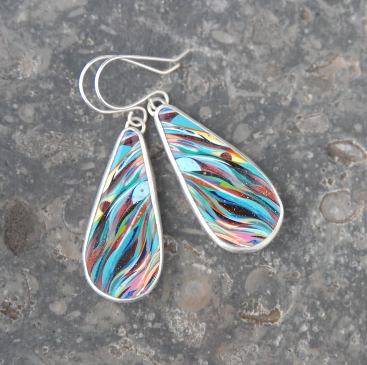 These colourful drop earrings have swirly surfite cabochons bezel set in sterling silver and have been finished with simple hooks (also sterling silver). The surfite has a particularly complicated pattern in many colours but predominately shades of blue and turquoise with some red and a hint of peach at the bottom. Most of the colours are opaque but a few are translucent and allow light to shine through.The patterns are a mirror matched pair. The earrings measure 50mm from the top of the hook to the bottom of the earring by 16mm across. Perfect gift for anyone who loves the unusual or surfing.