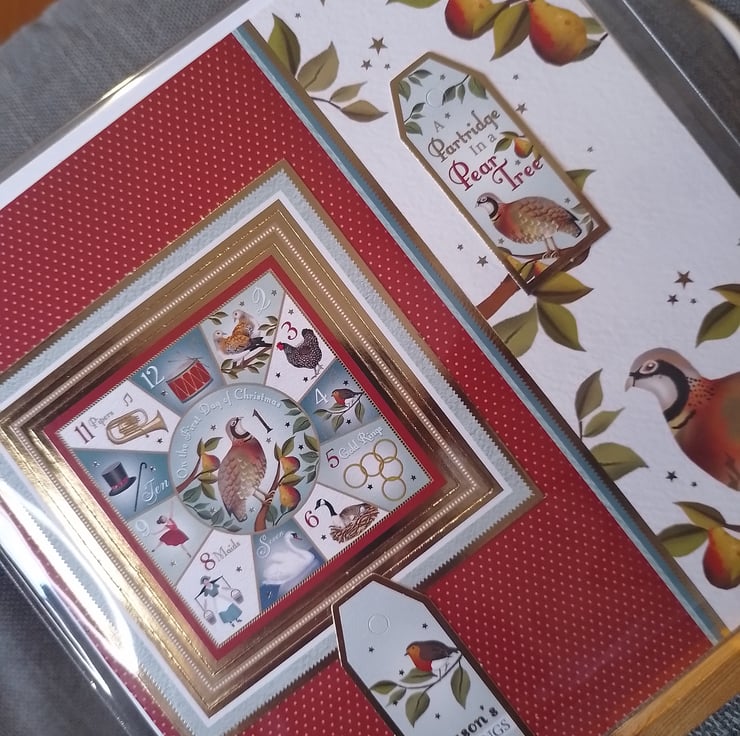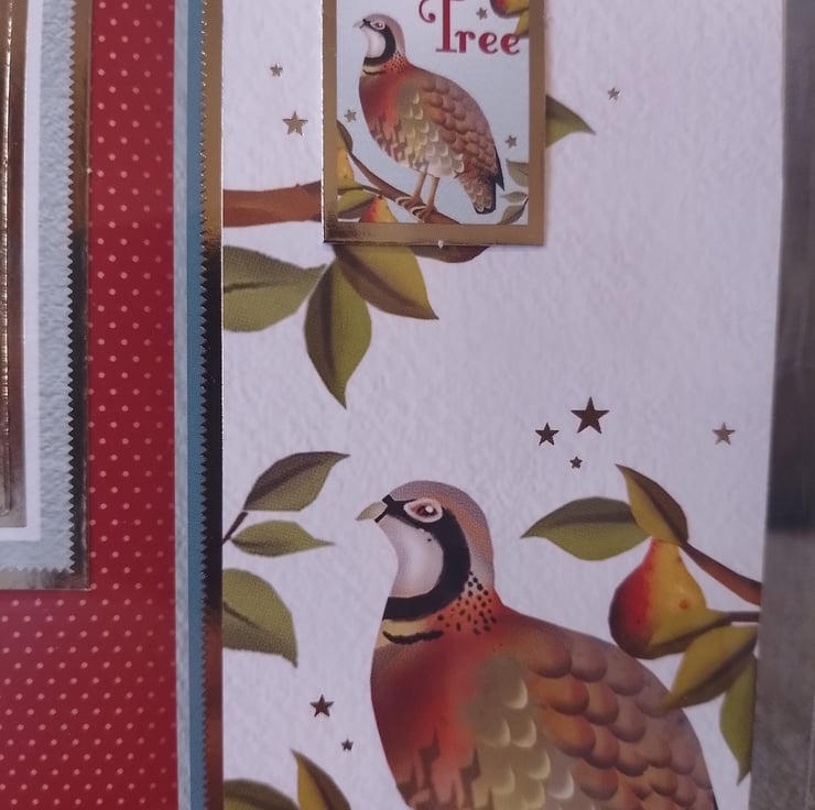 An 8" x 8" sq Christmas card showing a partridge in a pear tree. All cards come with matching envelopes and are cellophane-wrapped to keep them clean.