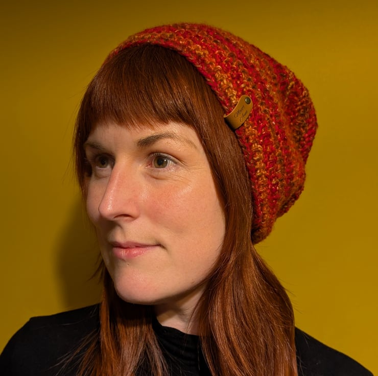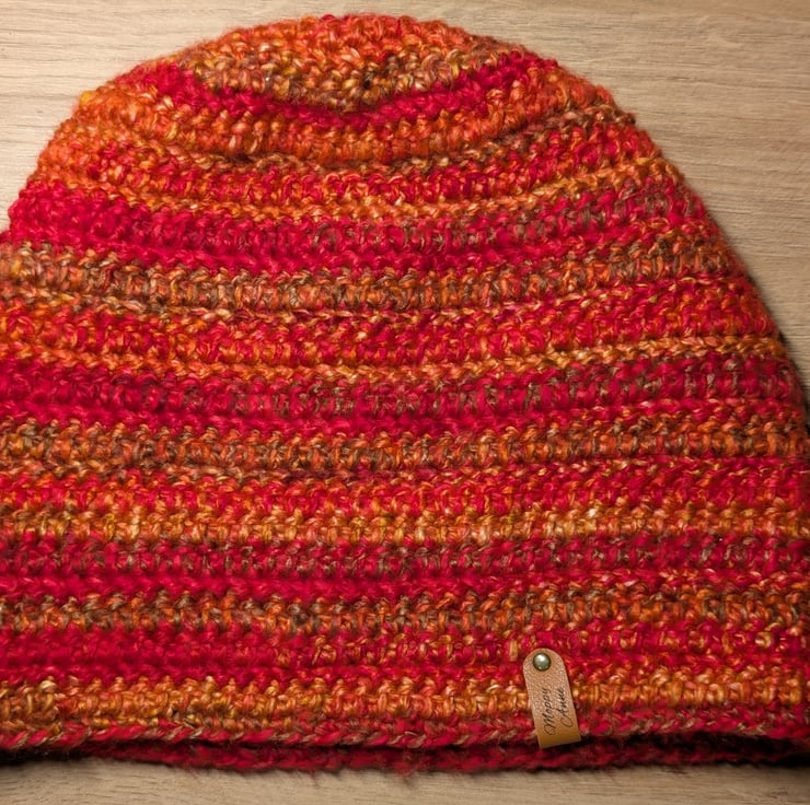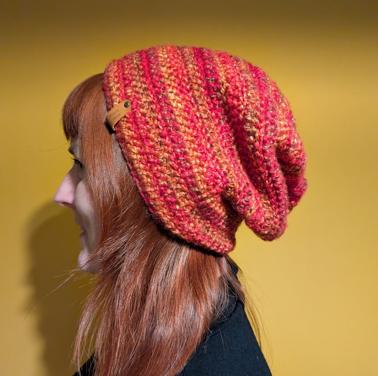 A Slouch beanie in warm tones, this hat is lovely and soft and the style suits a variety of people. Perfect as a gift this coming season. A faux leather brand label is attached for a classy finish. All products are handmade by me.