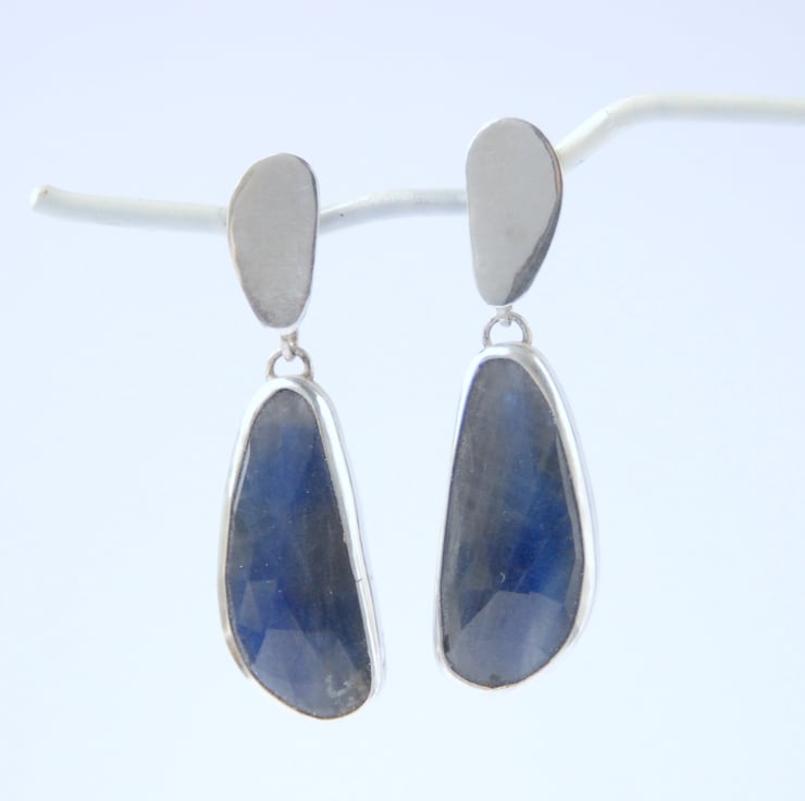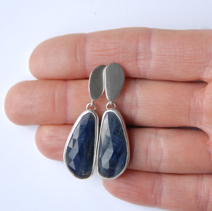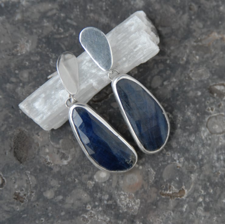These drop earrings feature navy blue sapphire cabochons which are bezel set in sterling silver and finished with a post and scroll fitting (also sterling silver). The sapphire is a dark almost navy blue with some greyer sections, it has been rose cut so it has facets on the top to catch the light and sparkle. They have an unusual shape which reminds me of a dragonfly wing which I have mimicked in the shape of the top portion of the earring which hides the stud post and scroll fitting. I was not told of any treatments that the sapphires might have had when I bought them but heat treatment is common for this stone so I'd assume it has been treated.