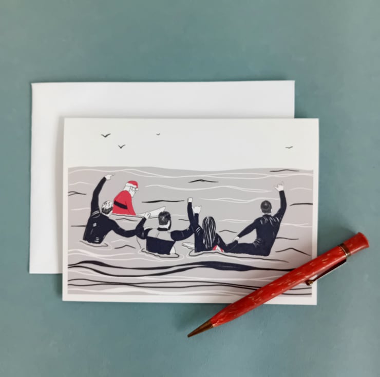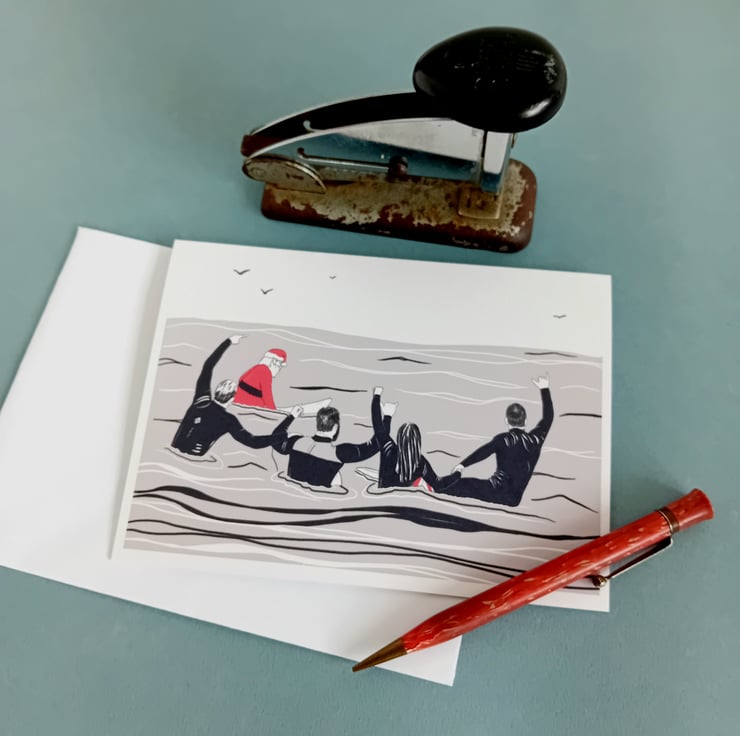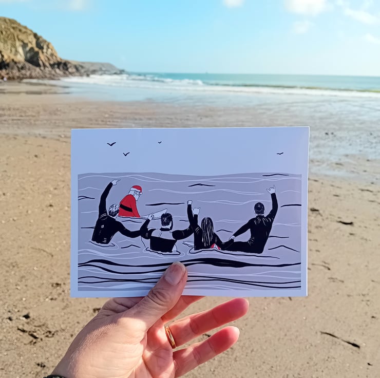 The ideal Christmas greetings card for the surfer in your life. This group of surfers are braving the winter waves and have a special friend with them. Apparently, Santa surfs when he has down time! This listing is for a pack of 5 surfing Santa Christmas cards.
