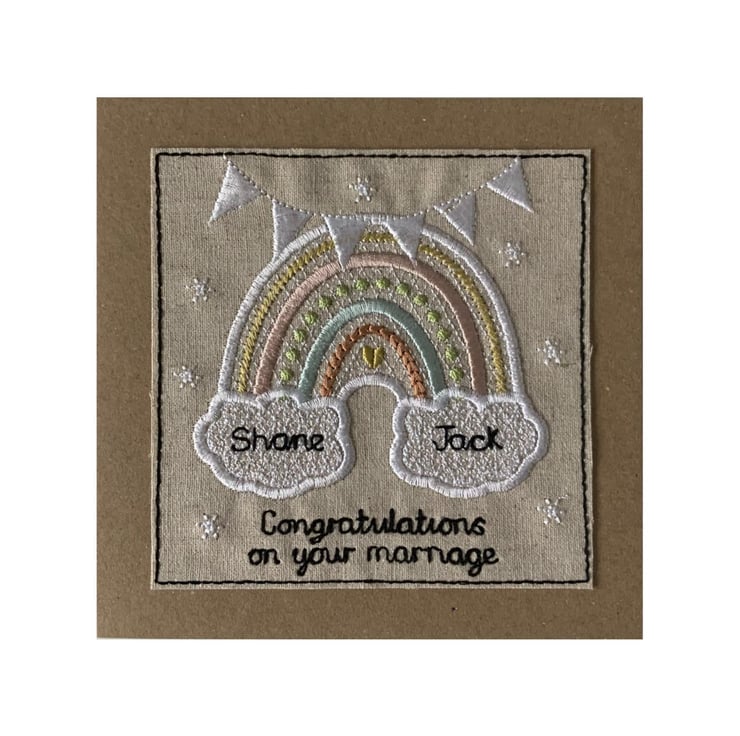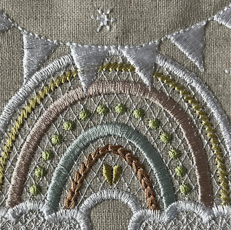 This is a rainbow embroidered card in a boho style stitched on a Natural linen base.