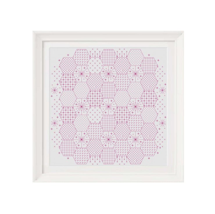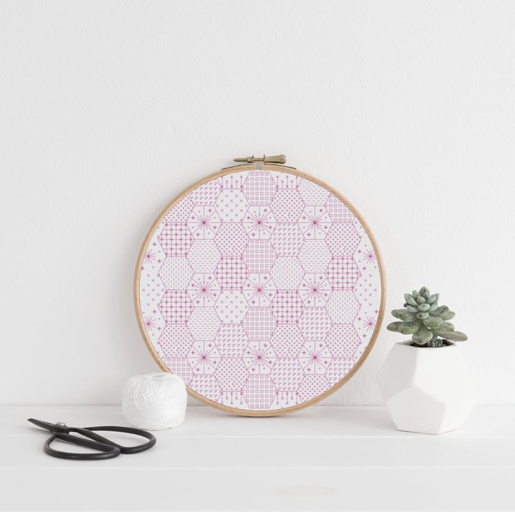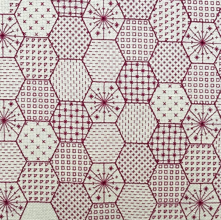 THREAD: There is just one colour of DMC 6 stranded floss. You can of course be as creative as you wish with alternative colours. Traditionally Blackwork is stitched using 1 strand of thread, however I have used 2 strands for the outline of the hexagons and 1 strand for the inner designs.
