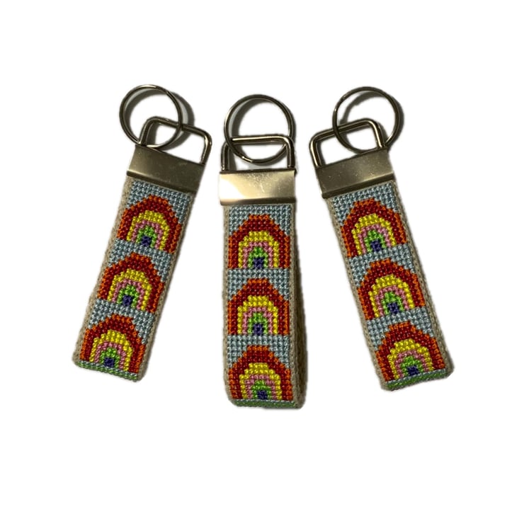 The cross stitch is stitched onto a Natural Linen blend base then sewn onto a great quality 25mm wide Cotton webbing, making a sturdy yet hand made keyring.