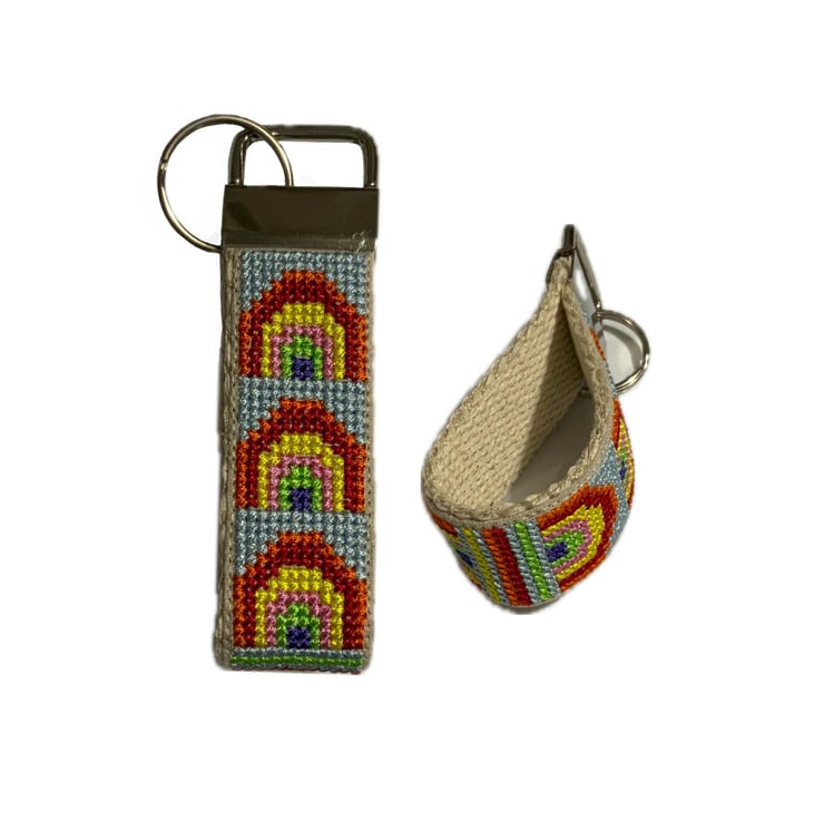 Keyring embroidered in bright rainbows in size 14pt cross stitch.