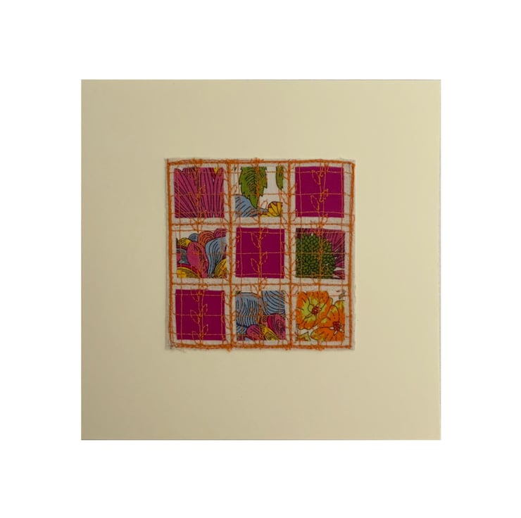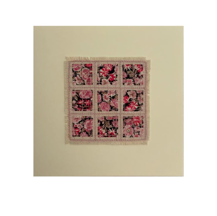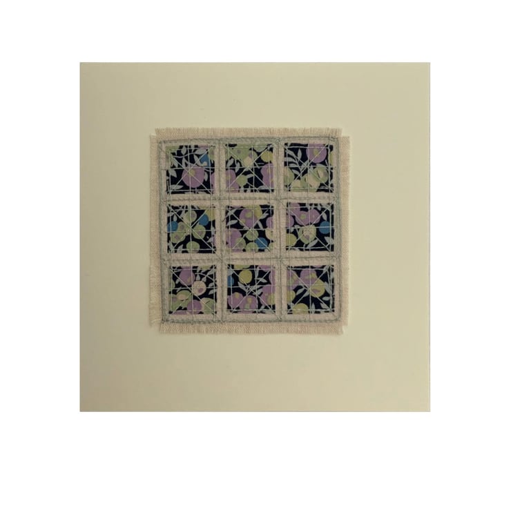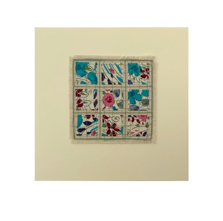 This is an embroidered card which feature small squares of Liberty fabrics stitched on a background of Natural linen. Please choose the design you would like from the dropdown menu.