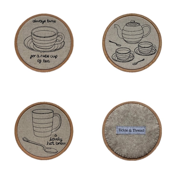 Striped teapot and tea cups embroidery, complete with tiny embroidered tea spoons, displayed in a hoop.