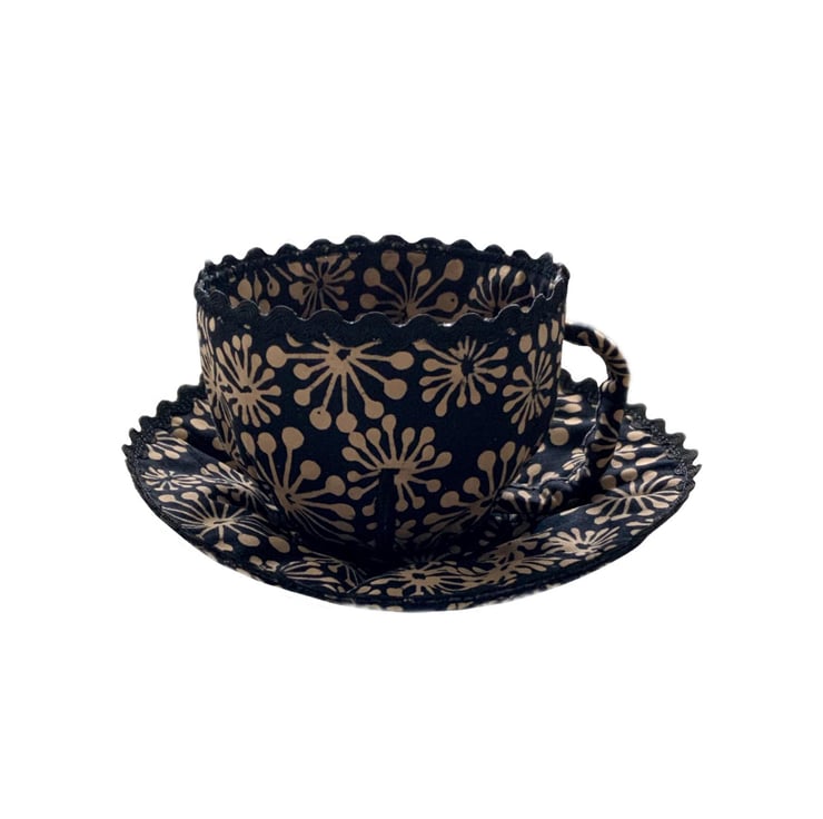 This is a handmade machine stitched textile teacup and saucer.