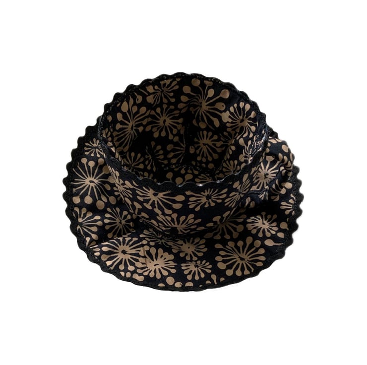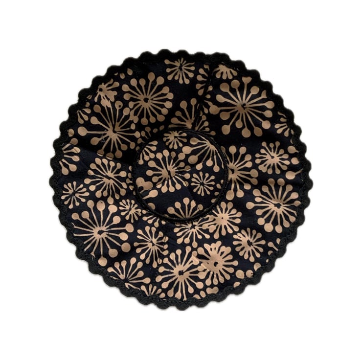 Made with a modern batik cotton fabric and trimmed with Black Rik-Rac.