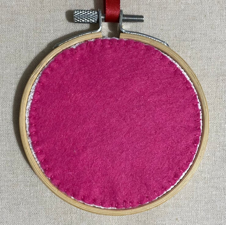 There'll only be one of these, and there are a few extra little details added from the original design. I just can't help myself! There is a Red satin ribbon loop so the hoop is ready for hanging as a decoration.