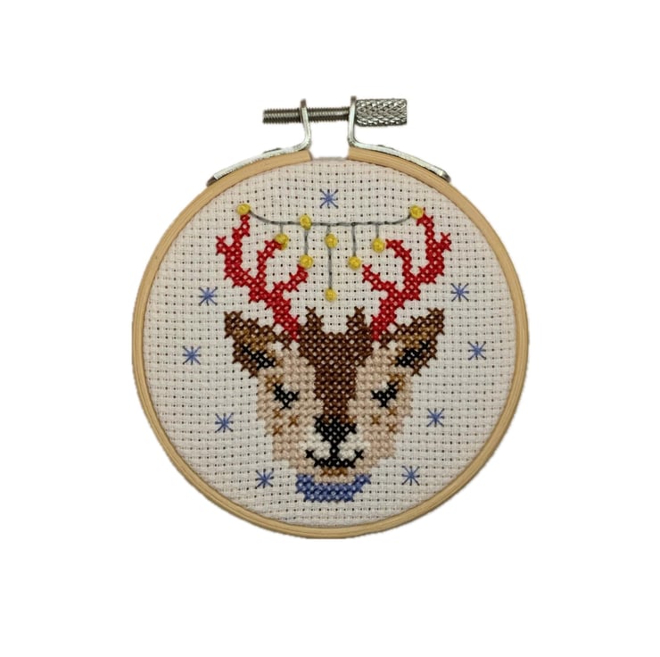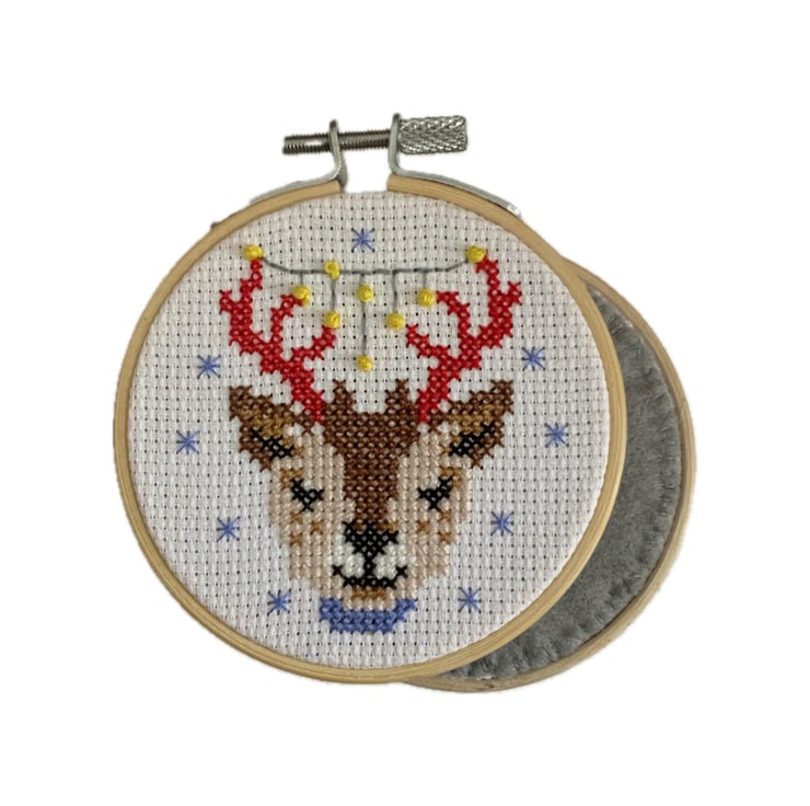 Cute baby reindeer cross stitch. I like to keep my hands busy and relaxed doing cross stitch. This little Christmas reindeer hoop was stitched using a kit from The Maker Arcade.