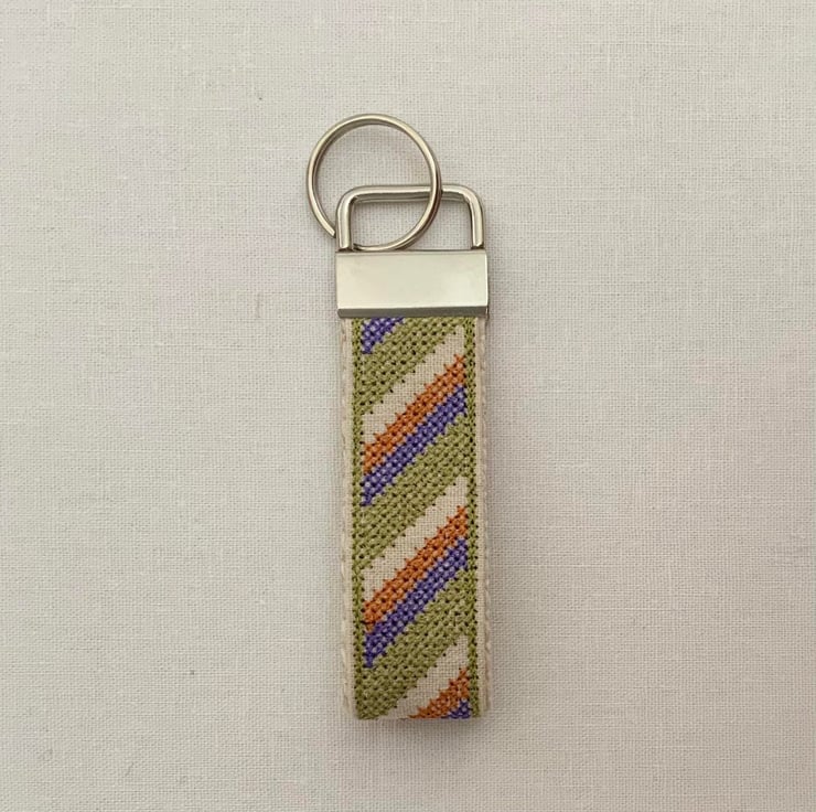 Keyring embroidered in 14pt cross stitch in muted bright shades of Lime, Purple and Orange.