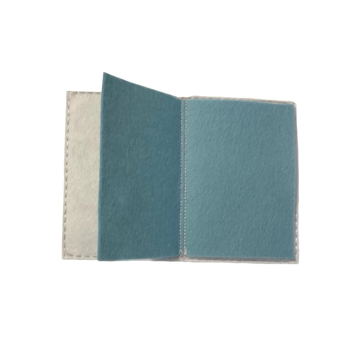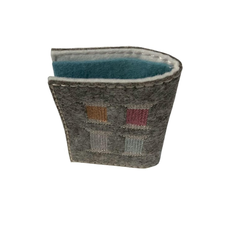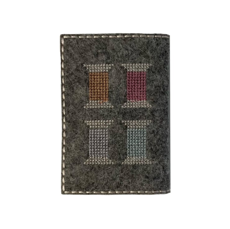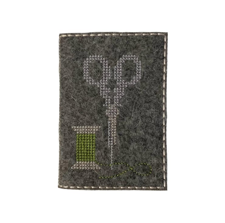 Embroidered needle book made from wool felt and embroidered in cross stitch with images of scissors and sewing threads. There are two felt pages to hold your needles.