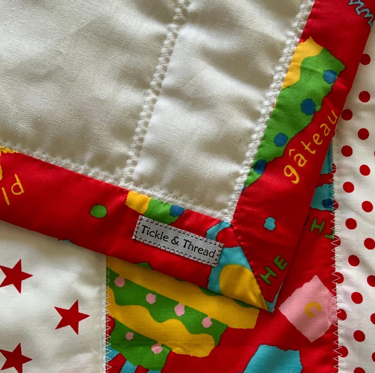 Red and White patchwork quilt featuring a Designers Guild fabric design of tea, cake and teddy bears matched with Red and White spots, stars and gingham. The patchwork quilt top is Cotton, and the reverse is White Linen.