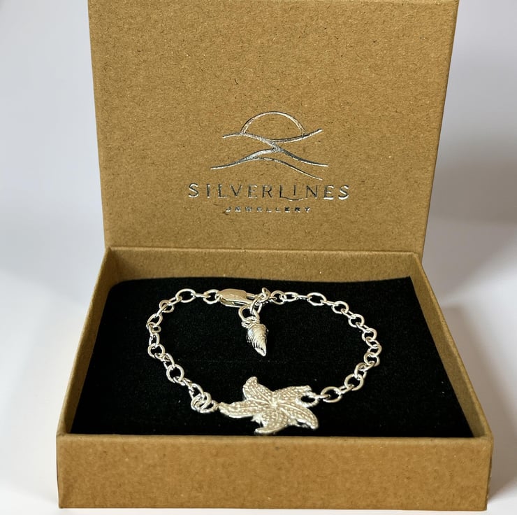 This stunning adjustable bracelet features a beautifully handcrafted fine silver starfish as its focal point, complemented by a delicate fine silver shell charm. The sterling silver chain offers an adjustable foot, allowing you to wear it at your preferred length. handmade in Woolacombe North Devon.