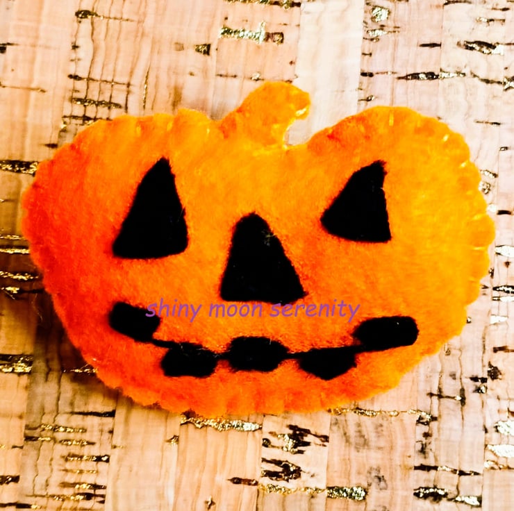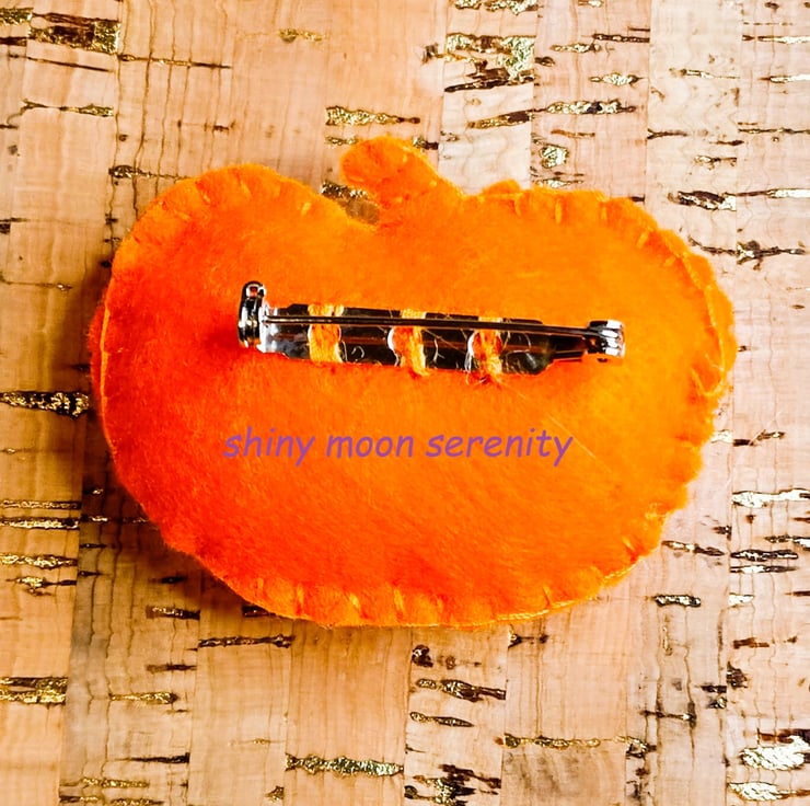 It is lightly stuffed with polyester toy stuffing and there is a brooch bar attached to the back of the pumpkin.