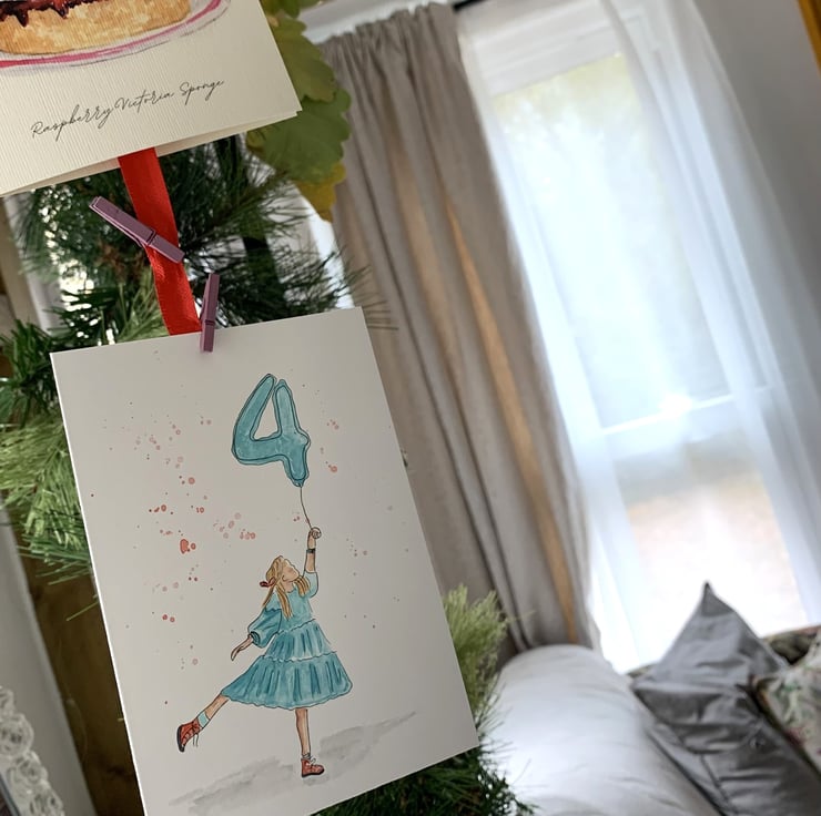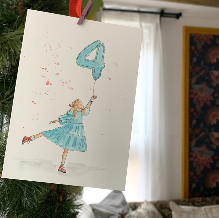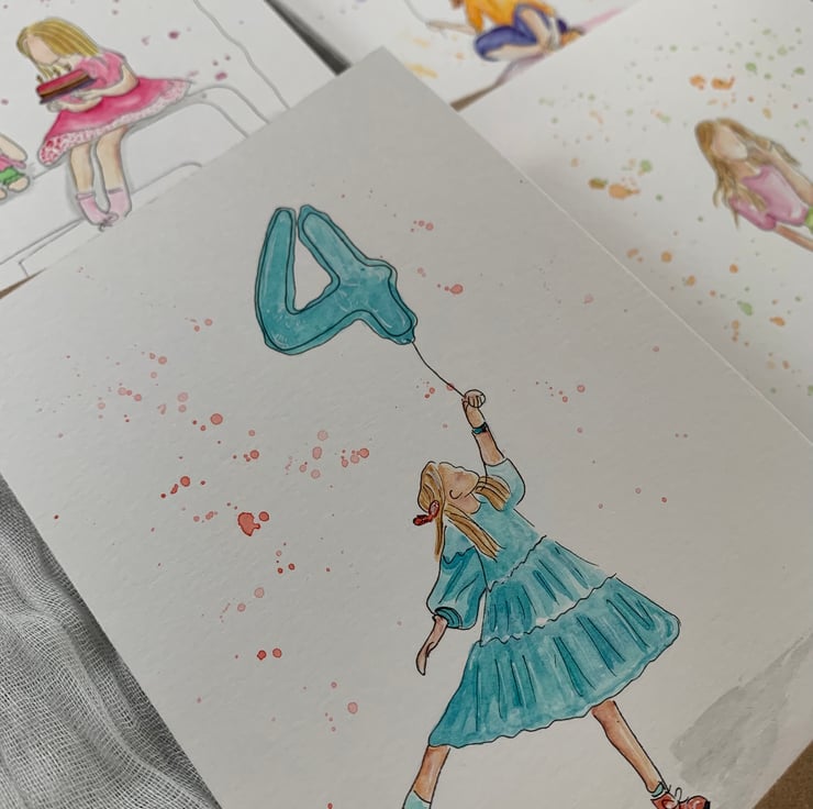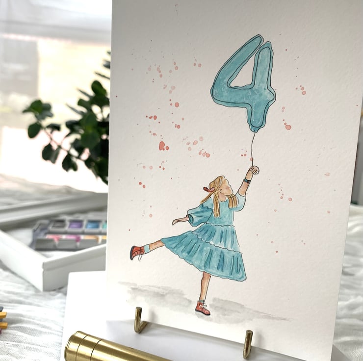 This card is part of my "Growing Birthday Girls" series, do check out the other numbers too and celebrate each year with a hand-painted card featuring a joyful girl holding her age in a balloon. Can't find the number you need? Feel free to message me your request and see if I can help :)