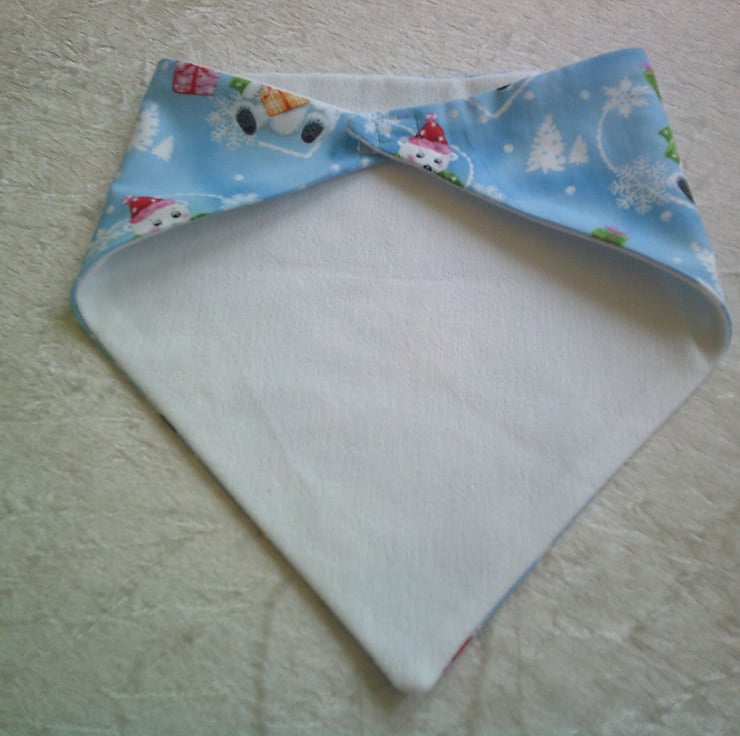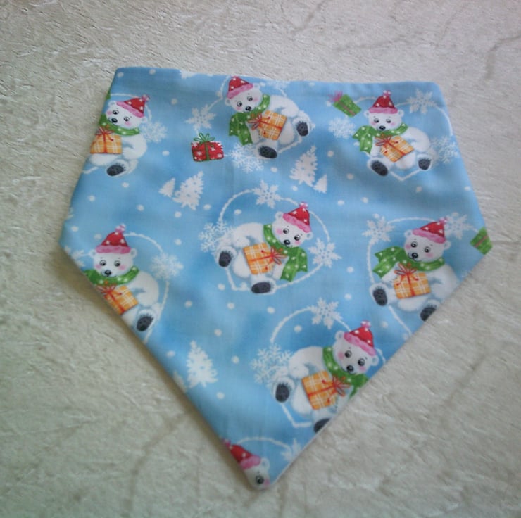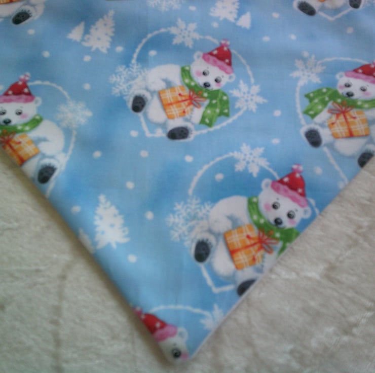 The fabric used for this dribble bib is of Polar Bears wearing Bobble hats and with parcels on a blue background.