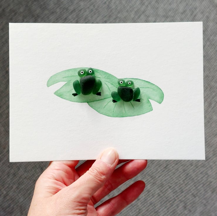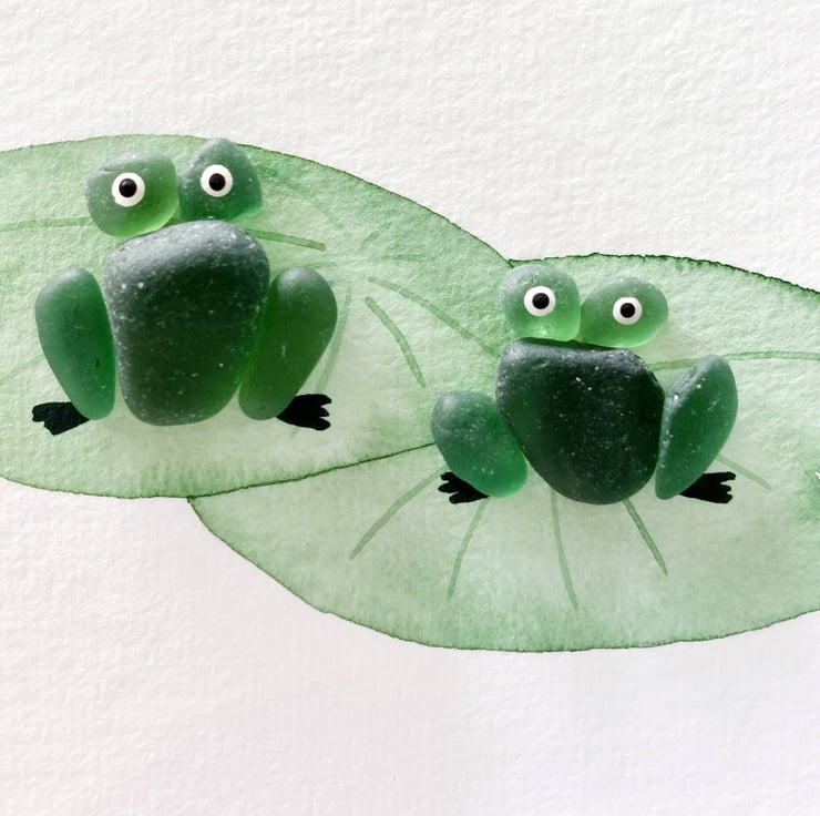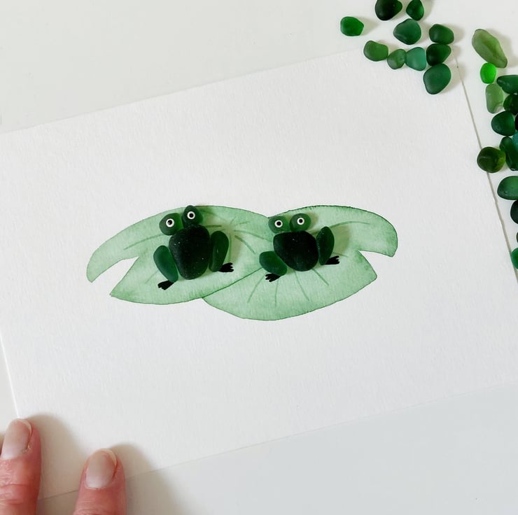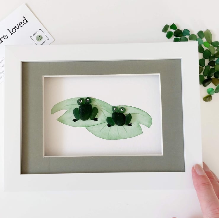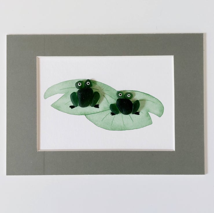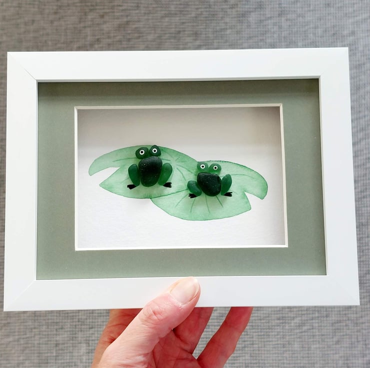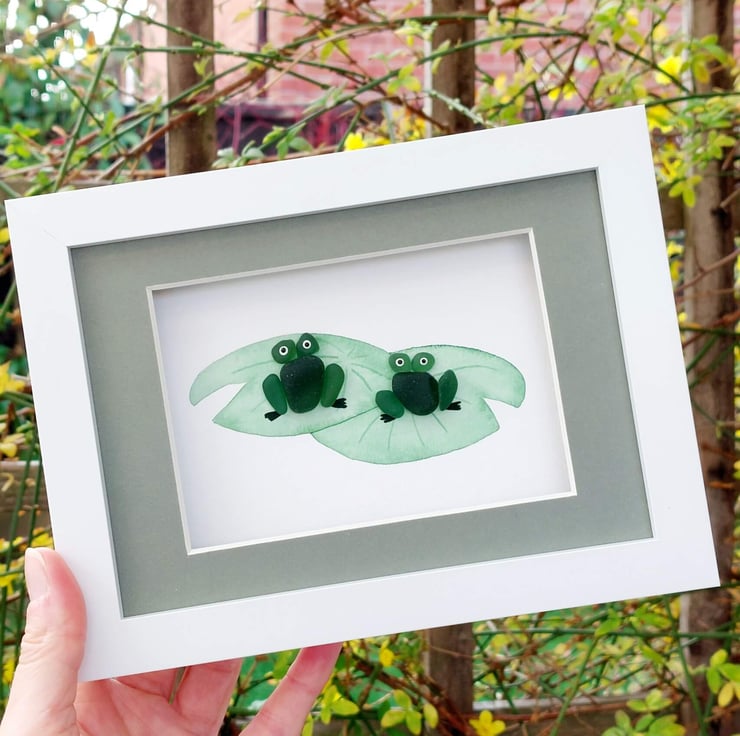 These adorable sea glass frogs in a frame make the perfect gift for the nature lover in your life. Beautifully crafted from hand-picked, bottle green sea glass, this arrives in a white frame, measuring 20cm x 15cm and a grey mount. Each frog has a quirky little character, complete with hand painted googly eyes, and they sit on a pair of lilypads, hand painted in fresh watercolours.