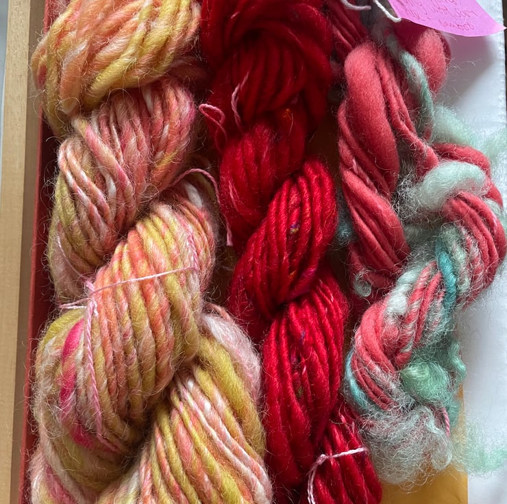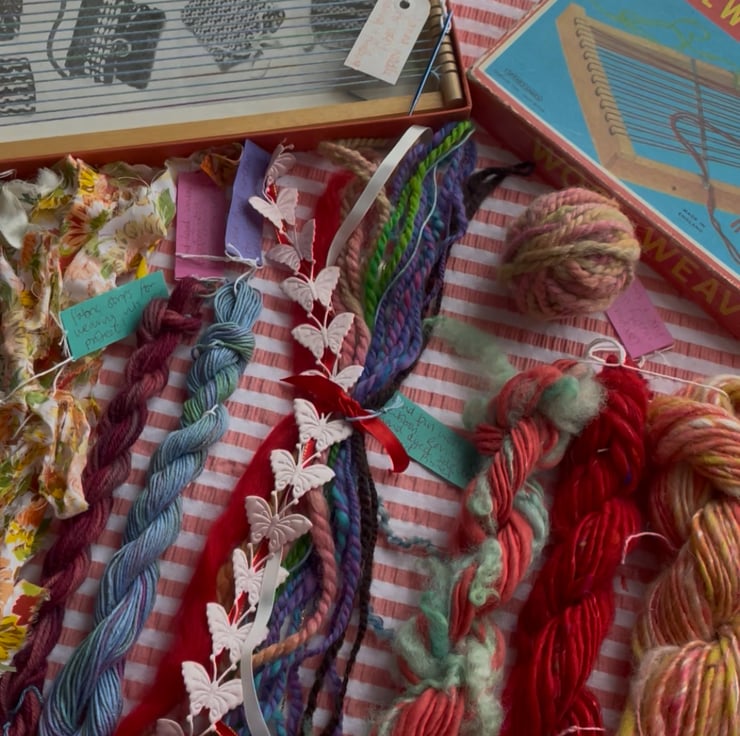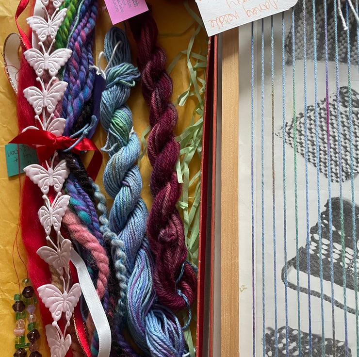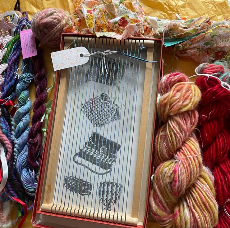 This one of a kind weaving kit has everything you need to make your first woven art piece! There is a selection of my own handspun yarns, reclaimed beads, a blunt darning needle, fabric strips, ribbons, hand-dyed vintage tapestry wool and hand-dyed cotton.