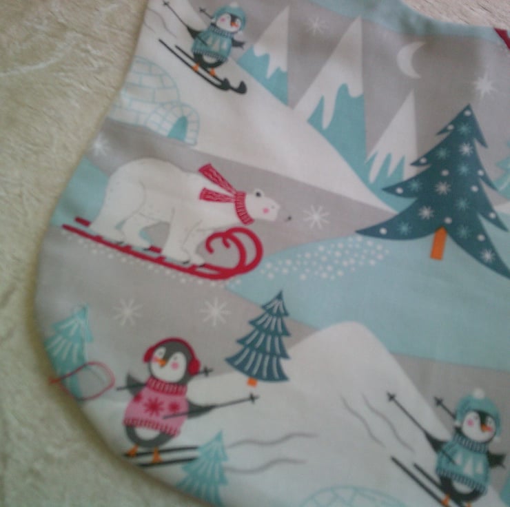 The design on the fabric used is of Penguins skiing, polar bears on sledges and trees ona white background. It is backed with Stretch Terry Towelling with a Velcro fastening at the neck so it is easy to put on and take off before and after feeding baby.