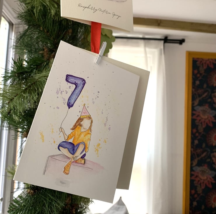 This card is part of my "Growing Birthday Girls" series, do check out the other numbers too and celebrate each year with a hand-painted card featuring a joyful girl holding her age in a balloon. Can't find the number you need? Feel free to message me your request and see if I can help :)
