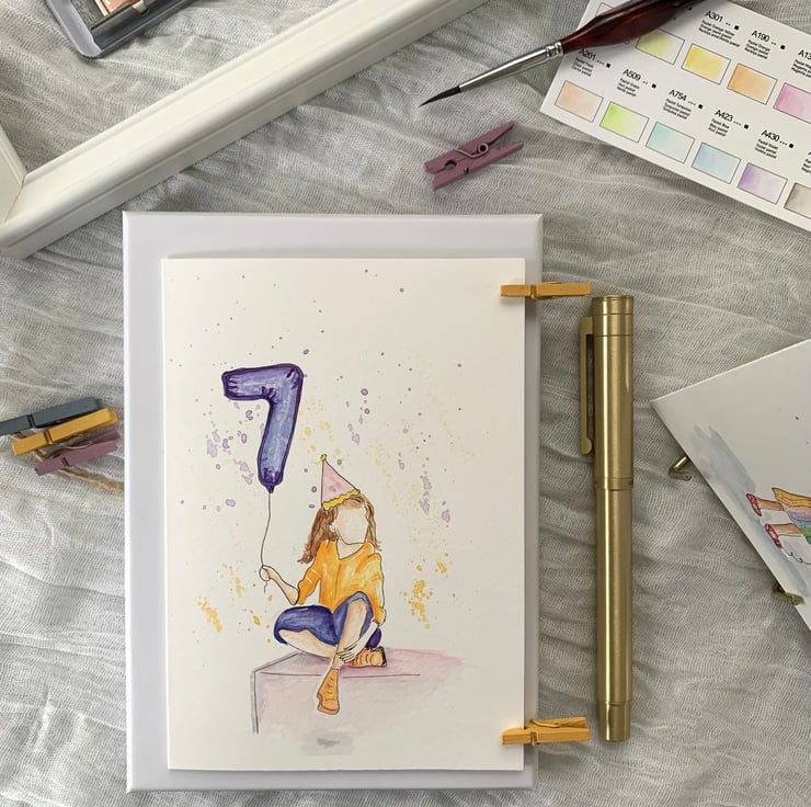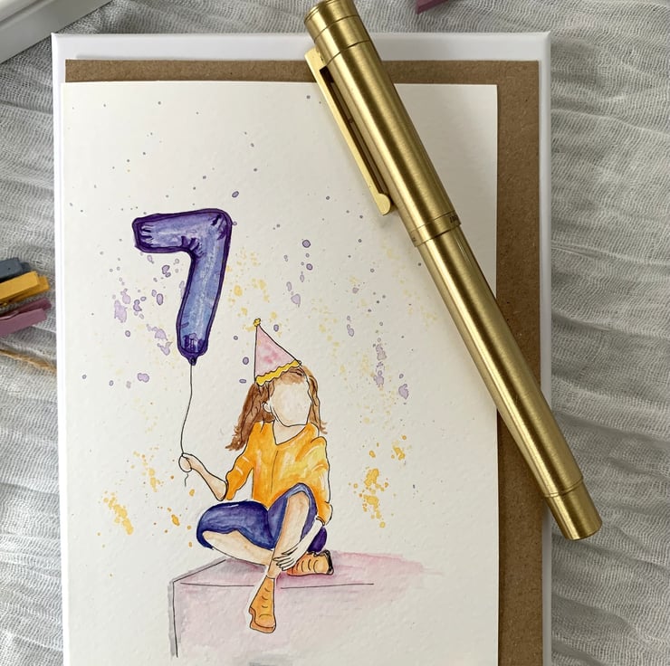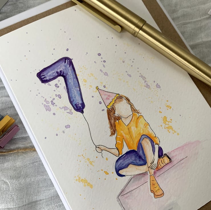 Celebrate turning seven with this original hand-painted birthday card, featuring a cheerful design in purple and sunny yellow-orange tones. The illustration shows a girl with a big number 7—bright, bold, and ready for the party. It’s playful without being too busy, with a clean layout and soft watercolour textures that make it feel special.