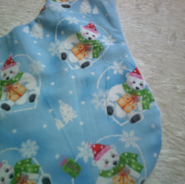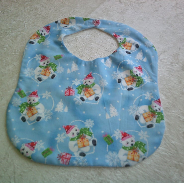 The design on the fabric used is of Polar Bears in bobble hats with parcels on a blue background. It is backed with Stretch Terry Towelling with a Velcro fastening at the neck so it is easy to put on and take off before and after feeding baby.