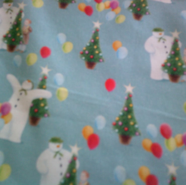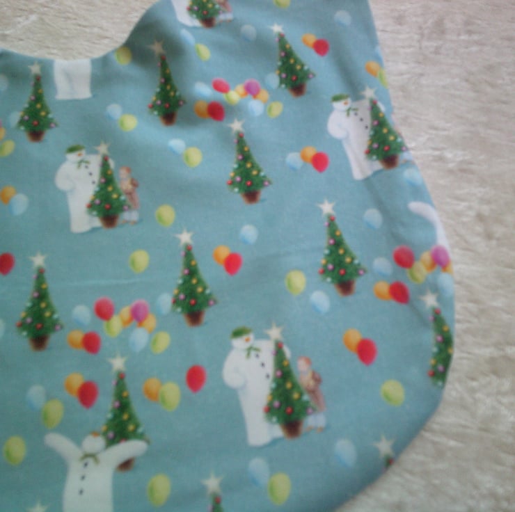 The design on the fabric used is of The Snowman, Tree and Boy on a blue background. It is backed with Stretch Terry Towelling with a Velcro fastening at the neck so it is easy to put on and take off before and after feeding baby.