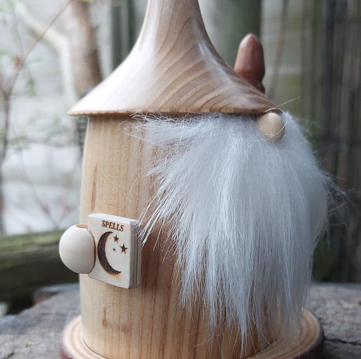 He has a wooden nose and hands which carry his all important Spell Book and his trusty Wooden Staff, usually made from oak, sapele or another exotic wood.