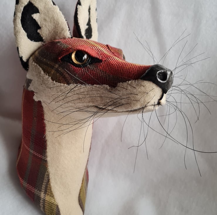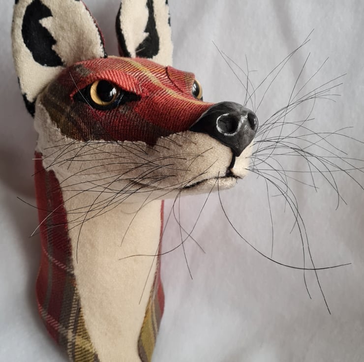 Medt Felix- A lifesize faux fox head which I have handmade and covered in hand stitched red tartan tweed fabric. The nose is handmade from polymer clay. The head is backed with felt and has a metal hanger to hang it on the wall. It is lightweight.
