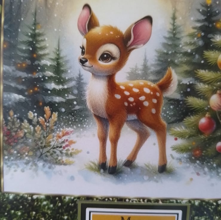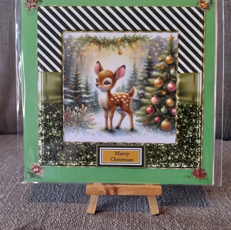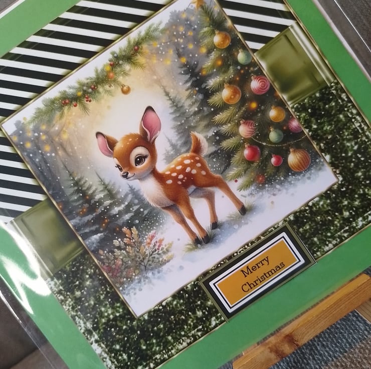 An 8" x 8" sq Christmas card showing a little deer amongst the Christmas trees. All cards come with matching envelopes and are cellophane-wrapped to keep them clean. cute little deer by a bauble bedecked tree