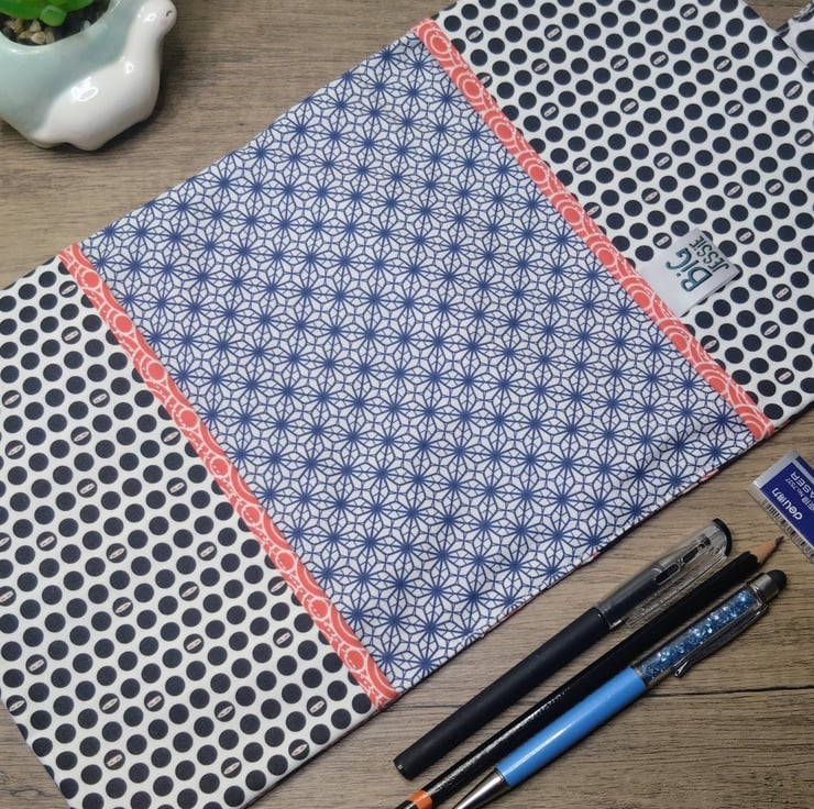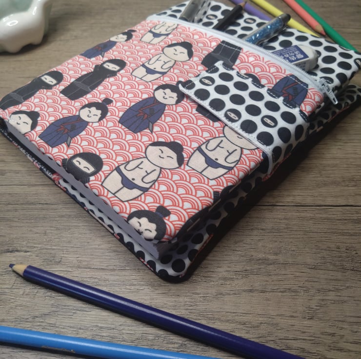 This A5 sketchbook has a fabric cover with pencil case. The fabric designs I have based upon kokeshi dolls in the style of Japanese fighters, ninja, samurai and sumo. Other patterns feature ninja polka dot and a geometric print.