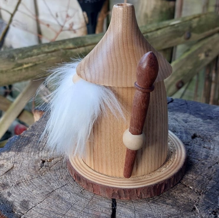 A wood slice with a little incense stone (for incense cones) sits under the Wizard and once lit the smoke from the cone magically billows up through the main body and out through the top of his hat.