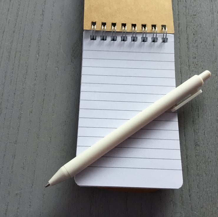 This spiral Notebook is 3 by 5 inches (12 by 7 cms) in size, with plenty of lined pages to write in, with the matching cream pen, that writes in black ink.