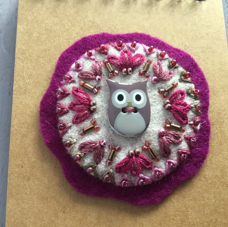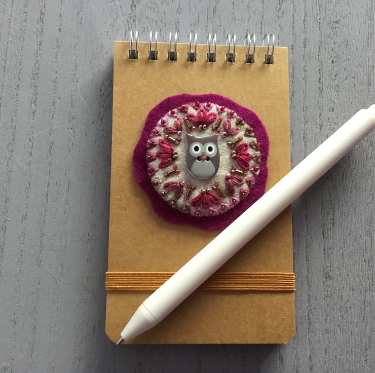 An Owl embroidery decorates the natural brown front cover of this spiral Notebook and Pen Set. A brown Owl button is stitched onto circles of cream and dark pink felt. She’s surrounded by hand embroidered Lazy Daisy and Fly Stitches with dark red and golden bugle and seed beads.