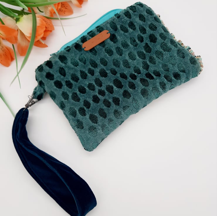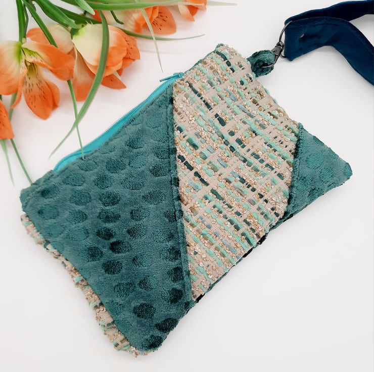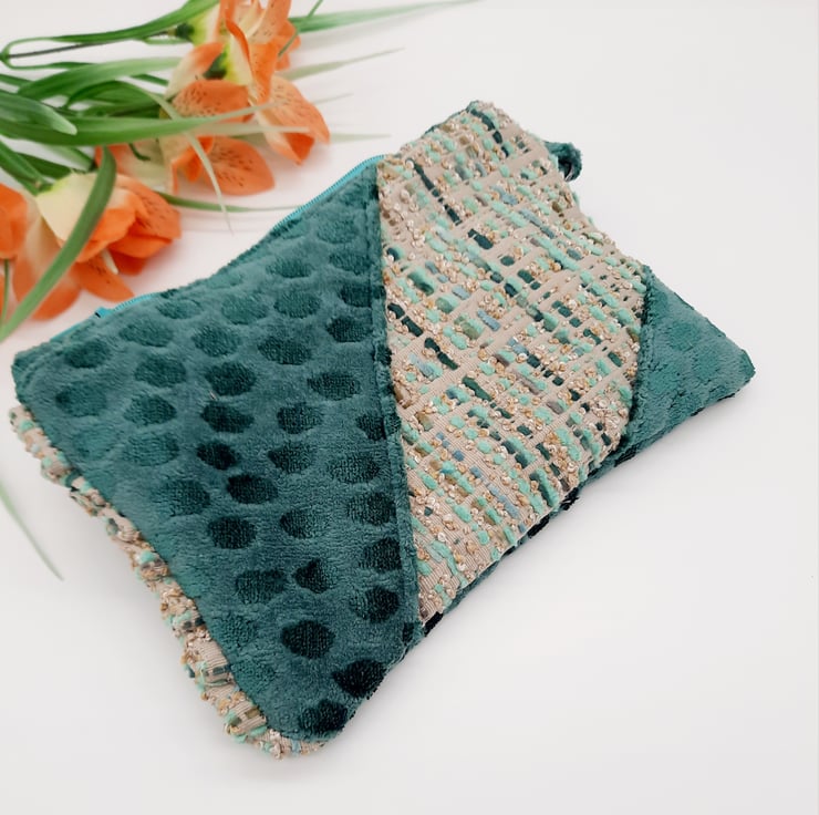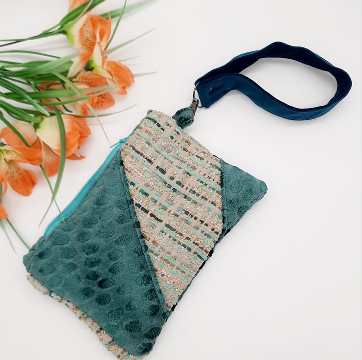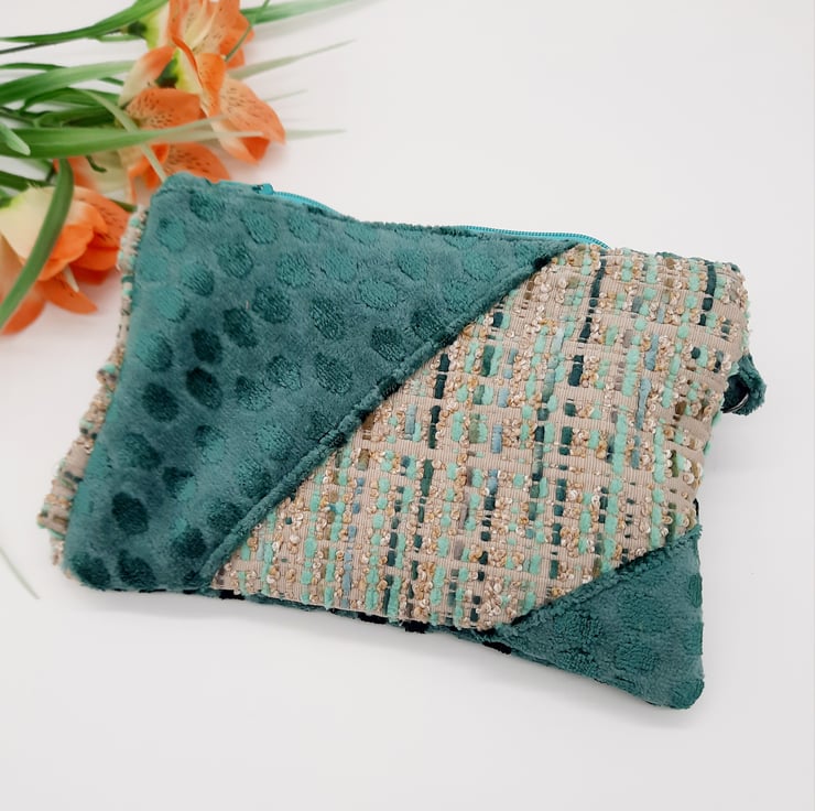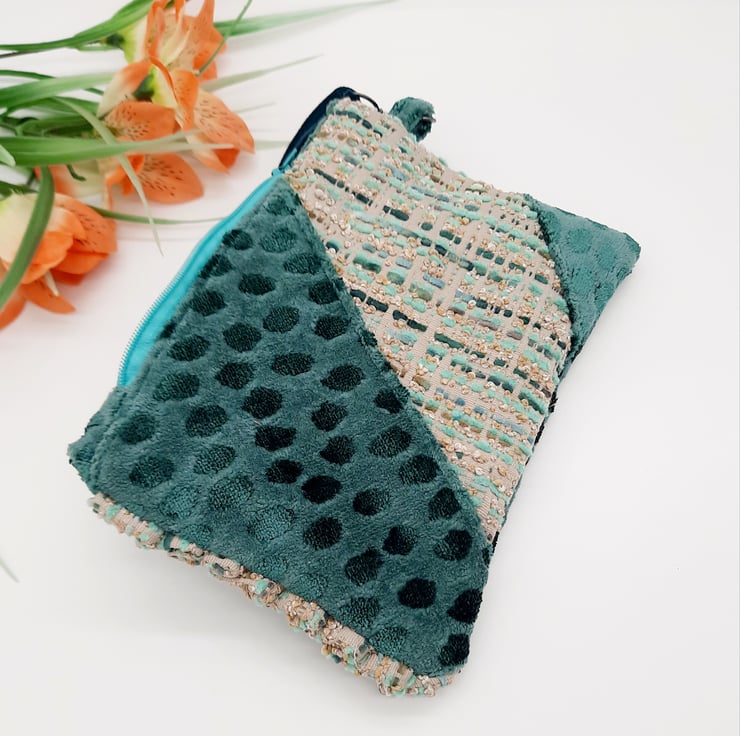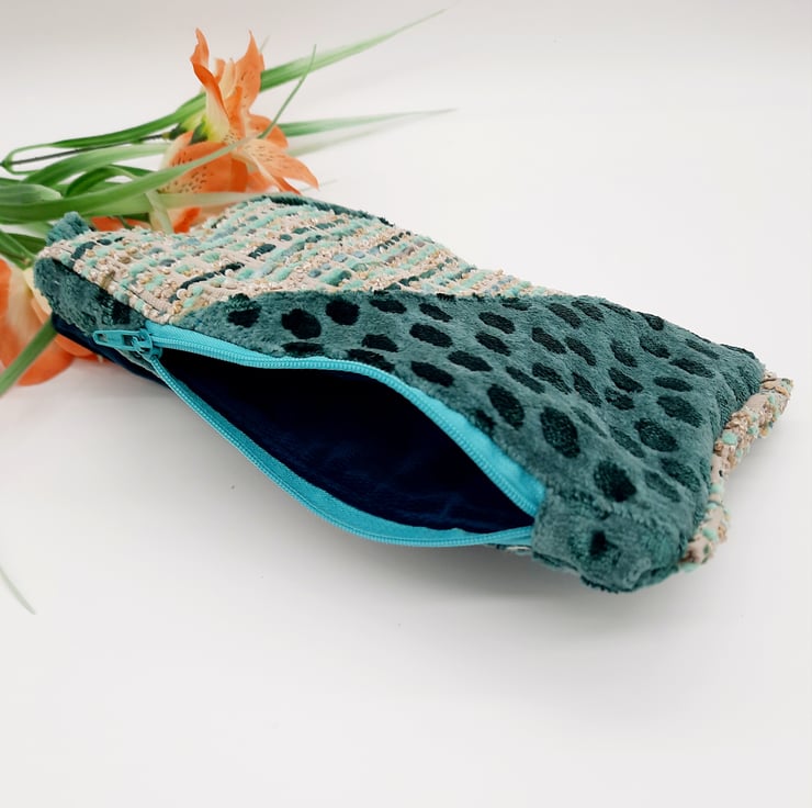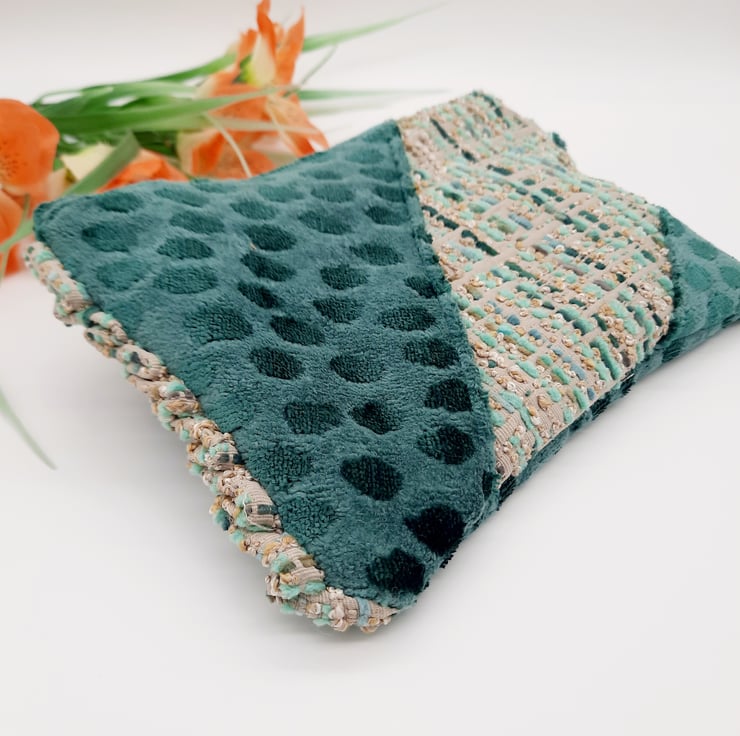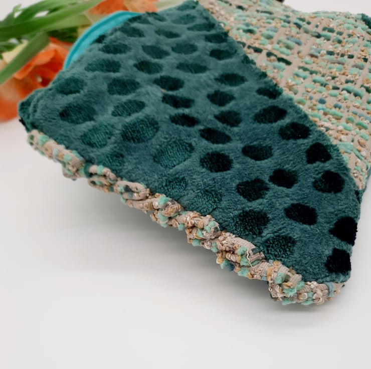 The third fabric is a dark teal velvet which has been used for the handle and the lining.