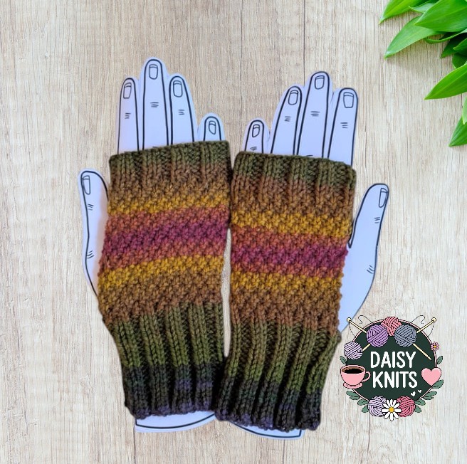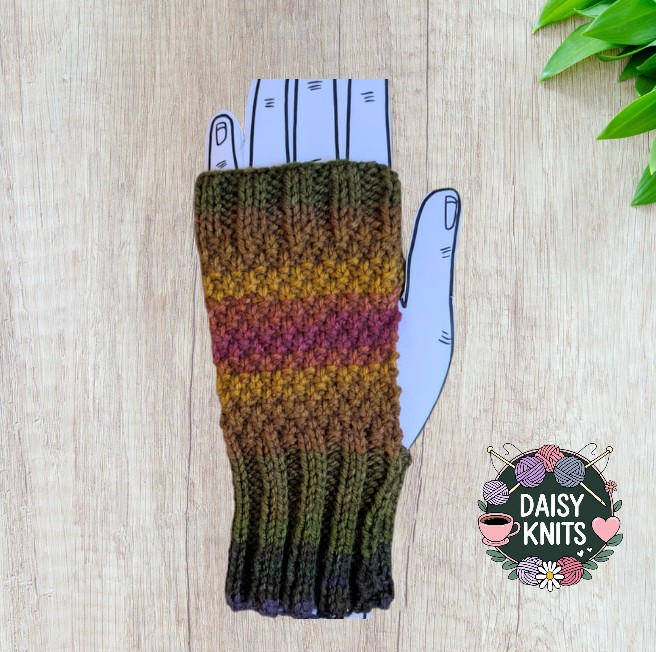 Fingerless gloves hand knitted with soft multi coloured yarn.