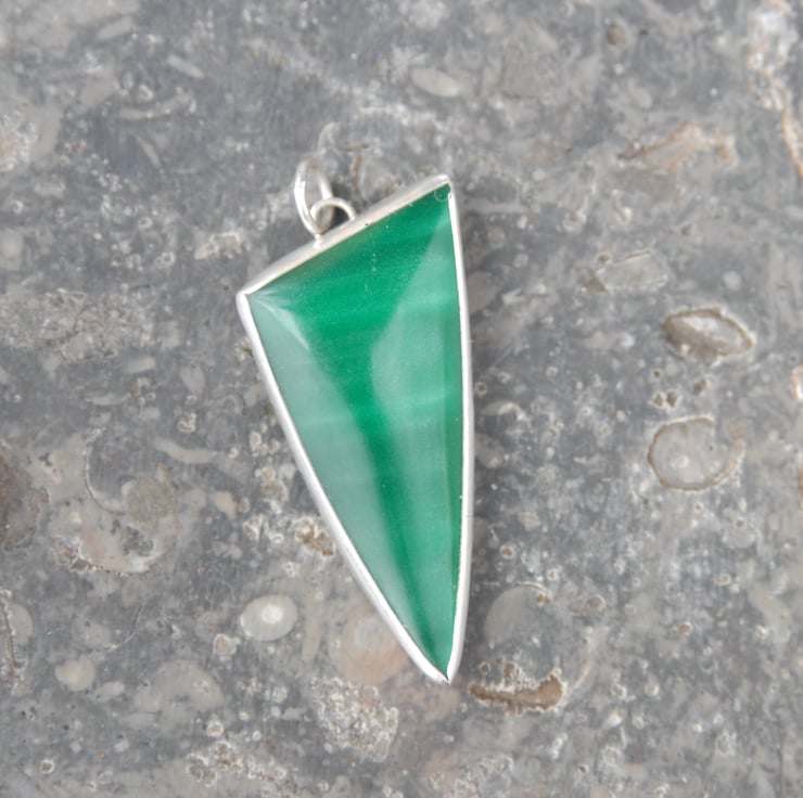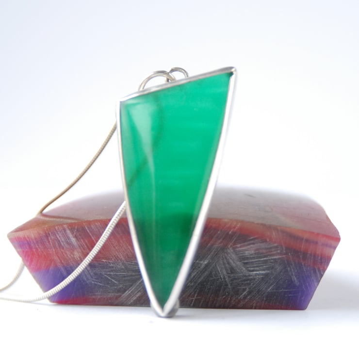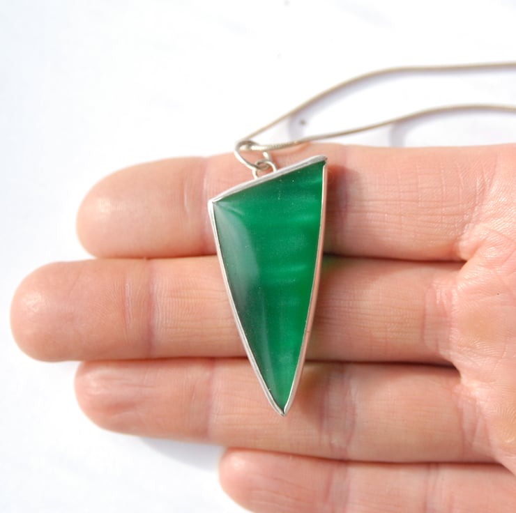 This statement pendant is given a sustainable twist by featuring apple green bowlerite which has been bezel set in recycled sterling silver. The bowlerite is the plastic recovered from the outside of old bowling balls and this one was a bright apple green with a hint of a silver shimmer when the light catches it. The pendant is triangular with a simple loop bail mounted along the short side so it sits point down. The pendant measures approx 50mm by 22mm and comes complete with a silver chain, bowlerite is light weight so theis would be comfortable to wear all day and into the night. Comes in a gift box.