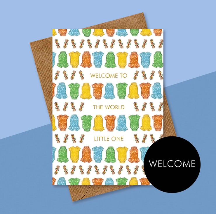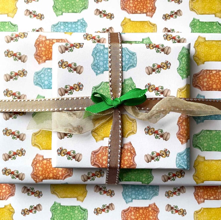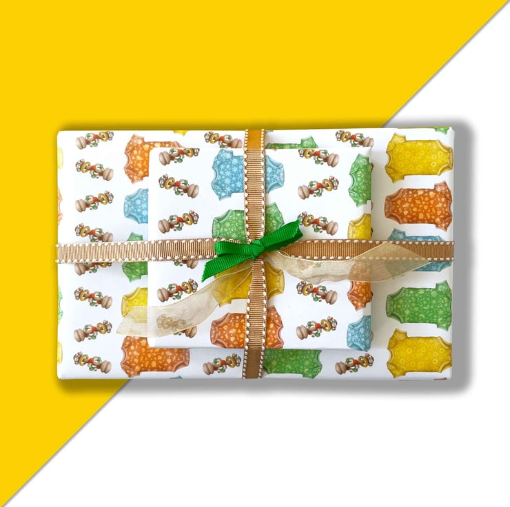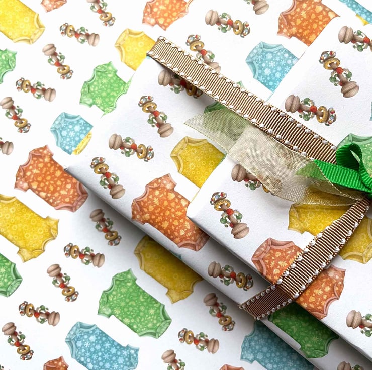 Featuring hand-illustrated baby rompers in soft seasonal patterns and a charming wooden rattle, this eco-friendly gift wrap is perfect for baby showers, new arrivals, or first birthdays. Printed in gentle hues of blue, green, yellow, and orange, it’s a gender-neutral design with heartwarming detail.