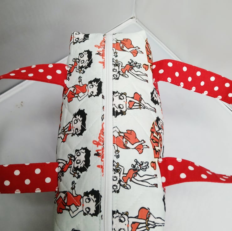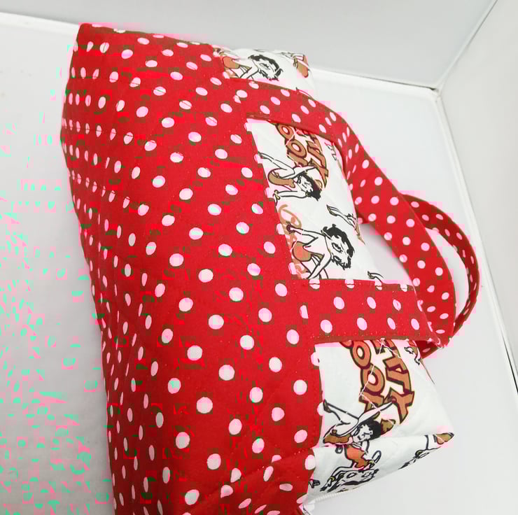 Betty Boop Bag, Quilted, multi purpose. This bag is made from 100% cotton. The bag fabric has wadding quilted together, quilted to give structure. Red and white spot bottom panel and handles. Betty Boop fabric for top panels. White cotton lining. For those who are into Betty Boop, this is a must have.